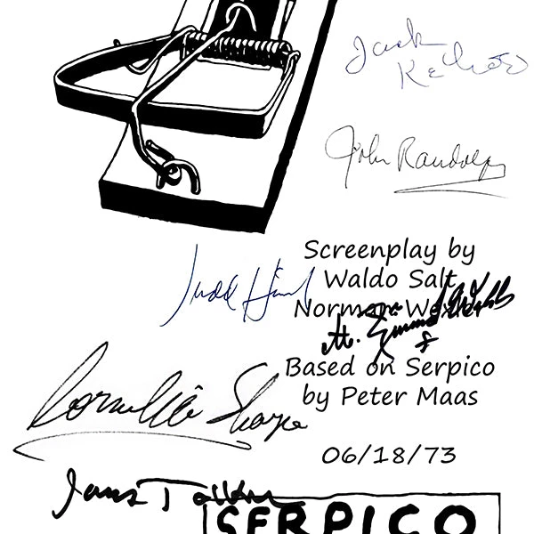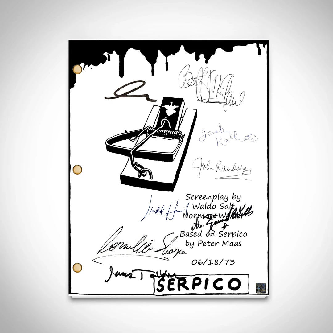 Pay homage to Serpico , with this Paramount Pictures fully licensed facsimile of the official signed movie script, originally signed by actors Al Pacino, John Randolph, James Tolkan, M.Emmet Walsh, Judd Hirsch, Jack Kehoe, Biff McGuire & Cornelia Sharpe , of which is strictly limited to 100 units Worldwide and has been approved and numbered accordingly.
