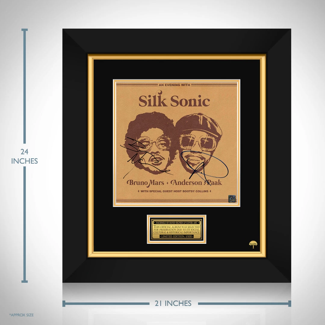 Pay homage to one of the most iconic of all time, Silk Sonic , with this gallery-framed, officially licensed, limited edition facsimile of the Hand-Signed An Evening with LP Cover originally signed by Bruno Mars & Anderson .Paak , of which is strictly limited to 100 units Worldwide, and has been approved and numbered accordingly.