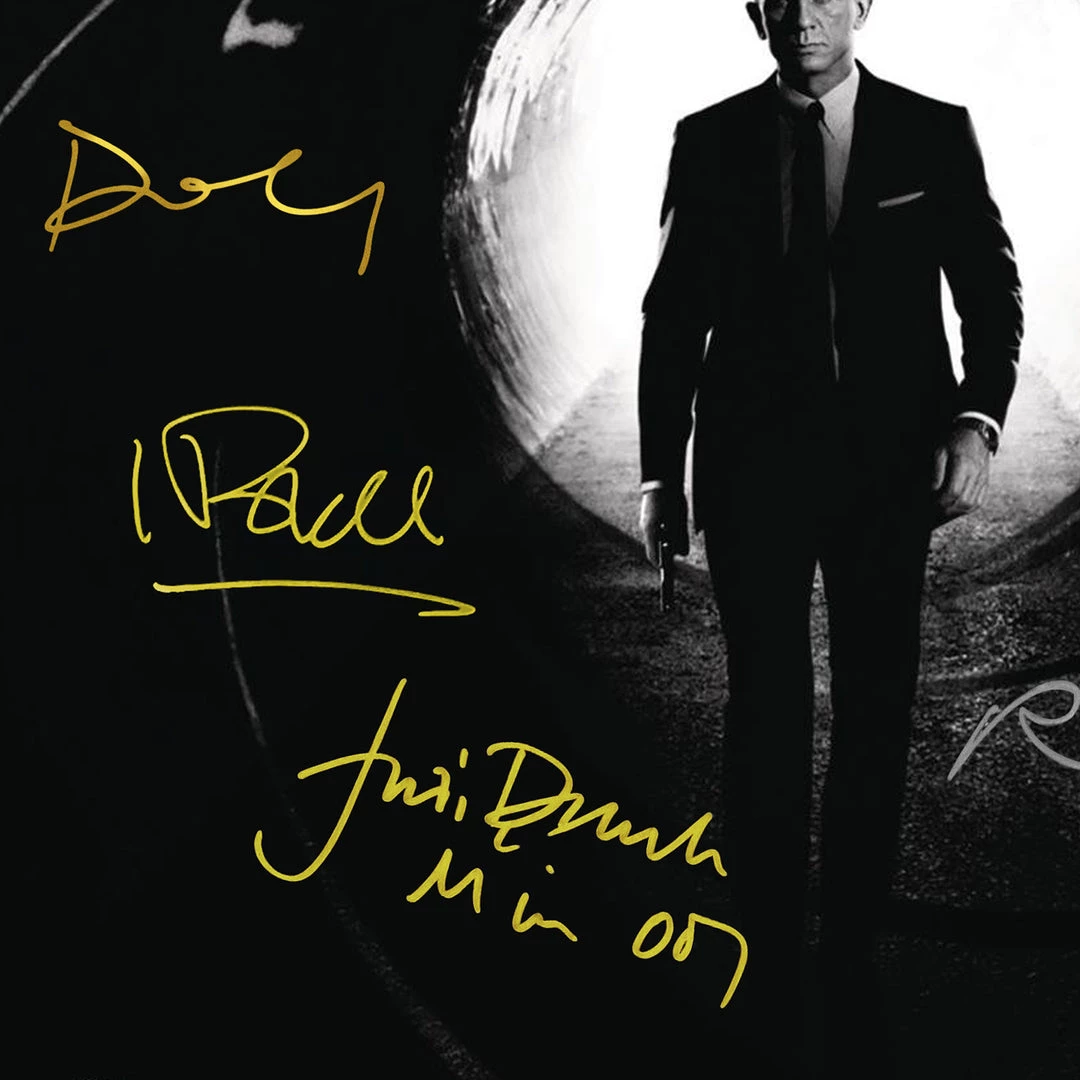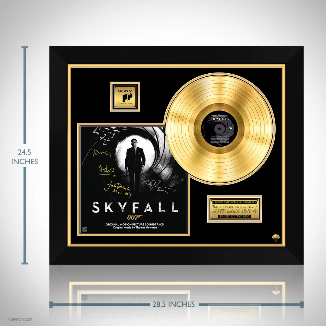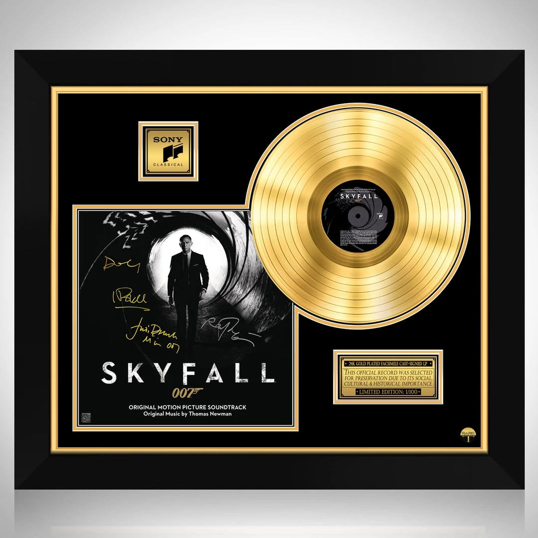Pay homage to one of the most iconic movie of all time Skyfall 007 , with this gallery-framed, authentic Sony Classical Records fully licensed facsimile of the official Hand-Signed 24K Gold LP Record and LP Cover soundtrack Originally signed by Daniel Craig, Judi Dench, Javier Bardem & Ralph Fiennes , of which is strictly limited to 100 units Worldwide and has been approved and numbered accordingly.