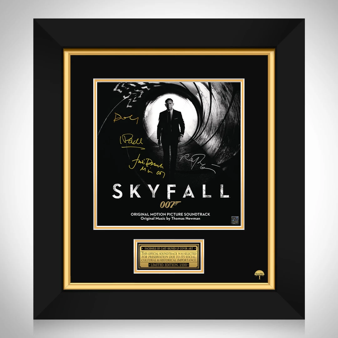 Pay homage to one of the most iconic movie of all time, Skyfall 007 , with this gallery-framed, officially licensed, limited edition facsimile of the Hand-Signed soundtrack LP Cover originally signed by Daniel Craig, Judi Dench, Javier Bardem & Ralph Fiennes , of which is strictly limited to 100 units Worldwide, and has been approved and numbered accordingly.