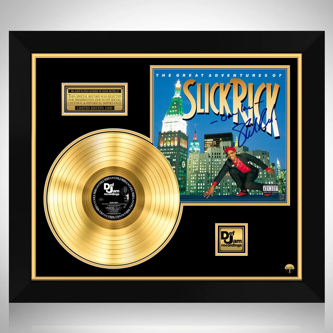 Pay homage to one of the most iconic British-American rapper, record producer of all time Slick Rick , with this gallery-framed, authentic Def Jam recordings fully licensed facsimile of the official Hand-Signed 24K Gold LP Record and LP Cover The Great Adventures of Slick Rick Originally signed by Slick Rick , of which is strictly limited to 100 units Worldwide and has been approved and numbered accordingly.