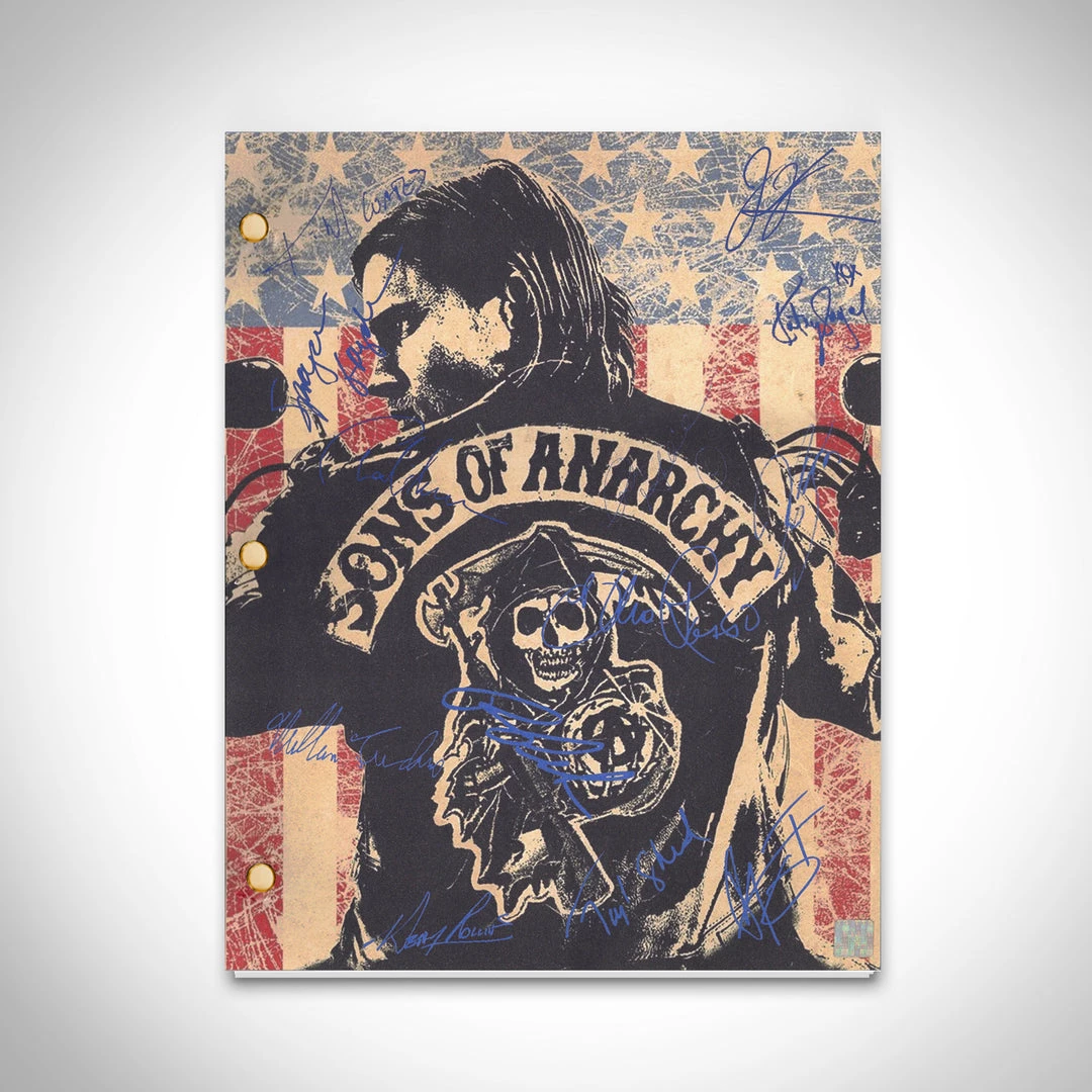 Pay homage to Sons of Anarchy , with this FX Network Studio  fully licensed facsimile of the official signed TV Series script, originally signed by actors Ron Perlman, Charlie Hunnam, Katey Sagal, Kurt Sutter & Mark Boone , of which is strictly limited to 100 units Worldwide and has been approved and numbered accordingly.
