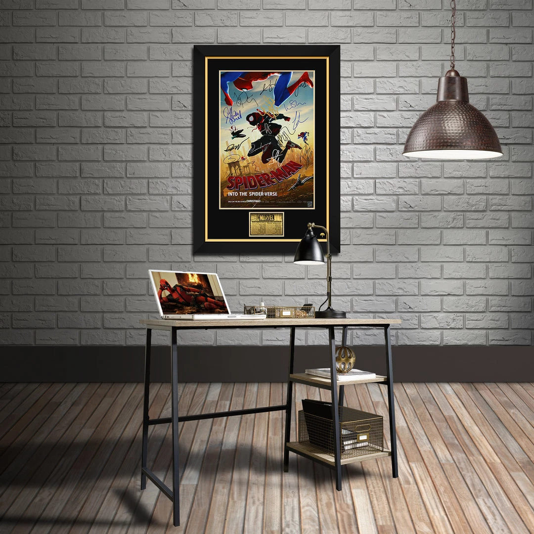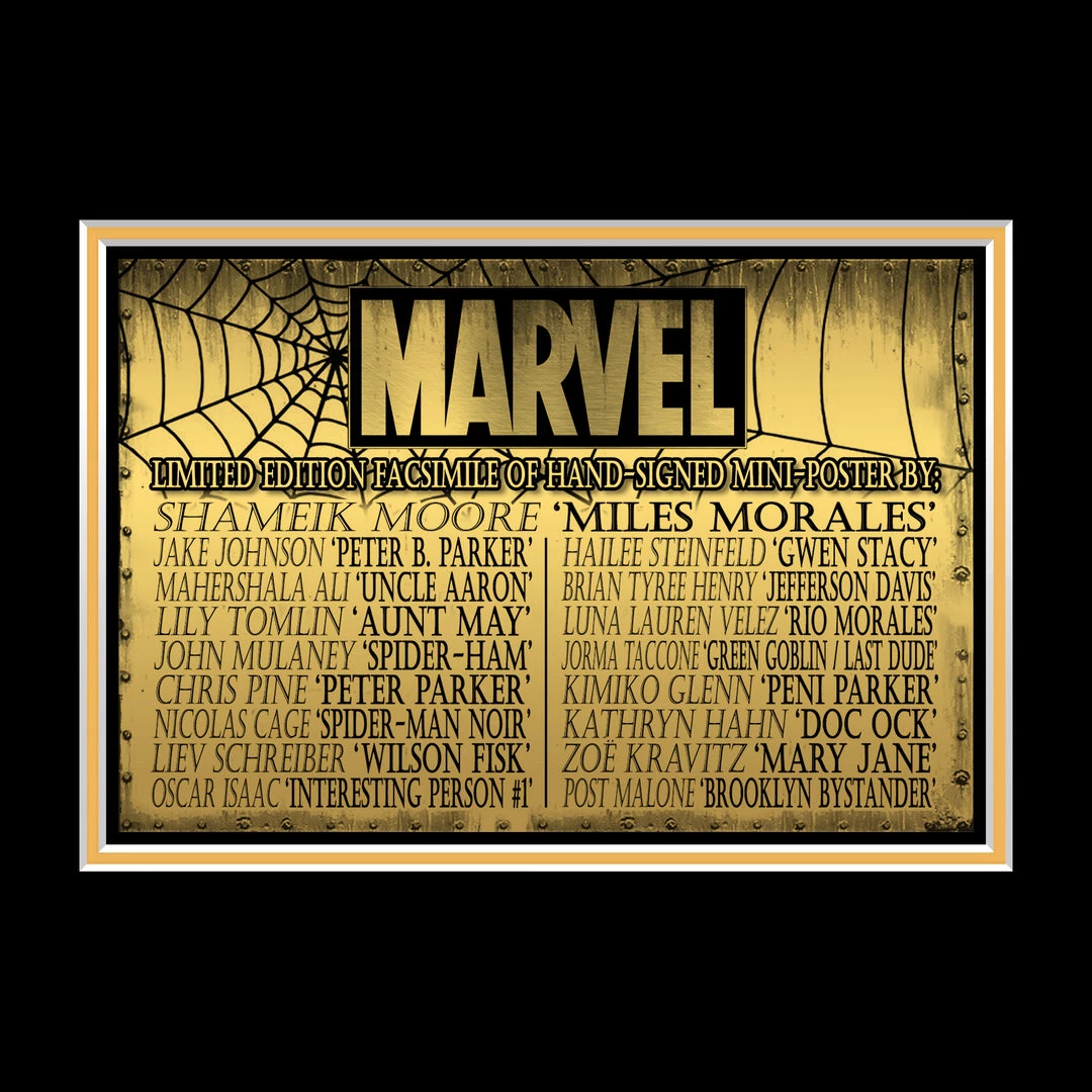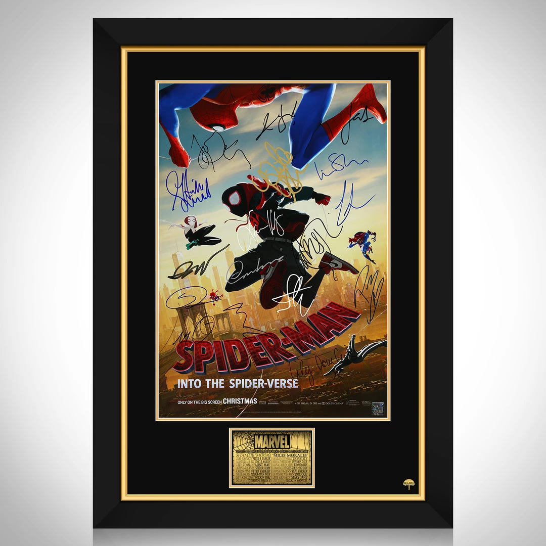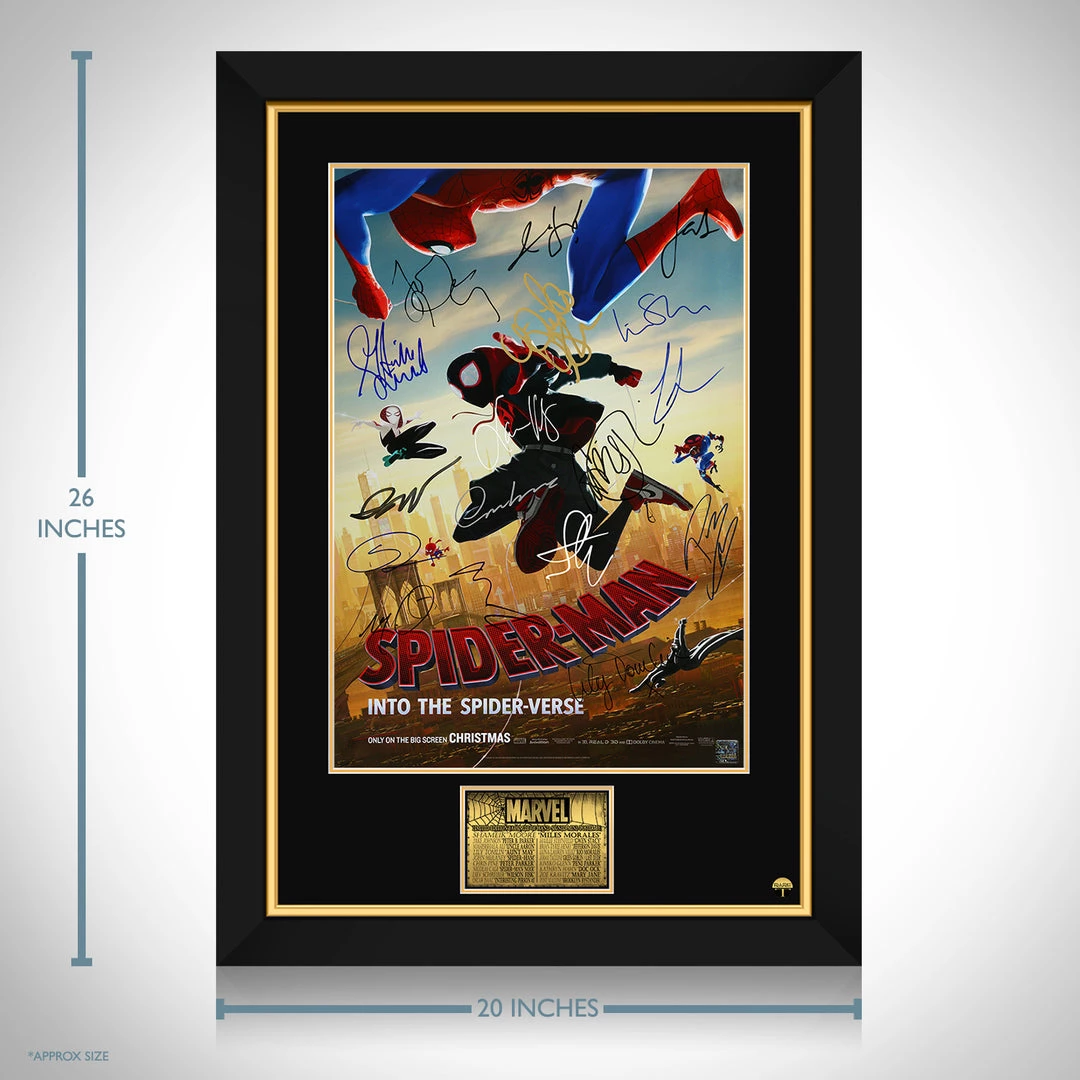 Pay homage to one of the most iconic film of all time, Spider-Man Into The Spider-Verse , with this gallery-framed, officially licensed, limited edition facsimile of hand-signed movie mini poster, originally signed by Shameik Moore, Jake Johnson, Mahershala Ali, Lily Tomlin, John Mulaney, Chris Pine, Nicolas Cage, Liev Schreiber, Oscar Isaac, Hailee Steinfeld, Brian Tyree Henry, Luna Lauren Velez, Jorma Taccone, Kimiko Glenn, Kathryn Hahn, Zoe Kravitz & Post Malone, of which is strictly limited to 100 units Worldwide, and has been approved and numbered accordingly.