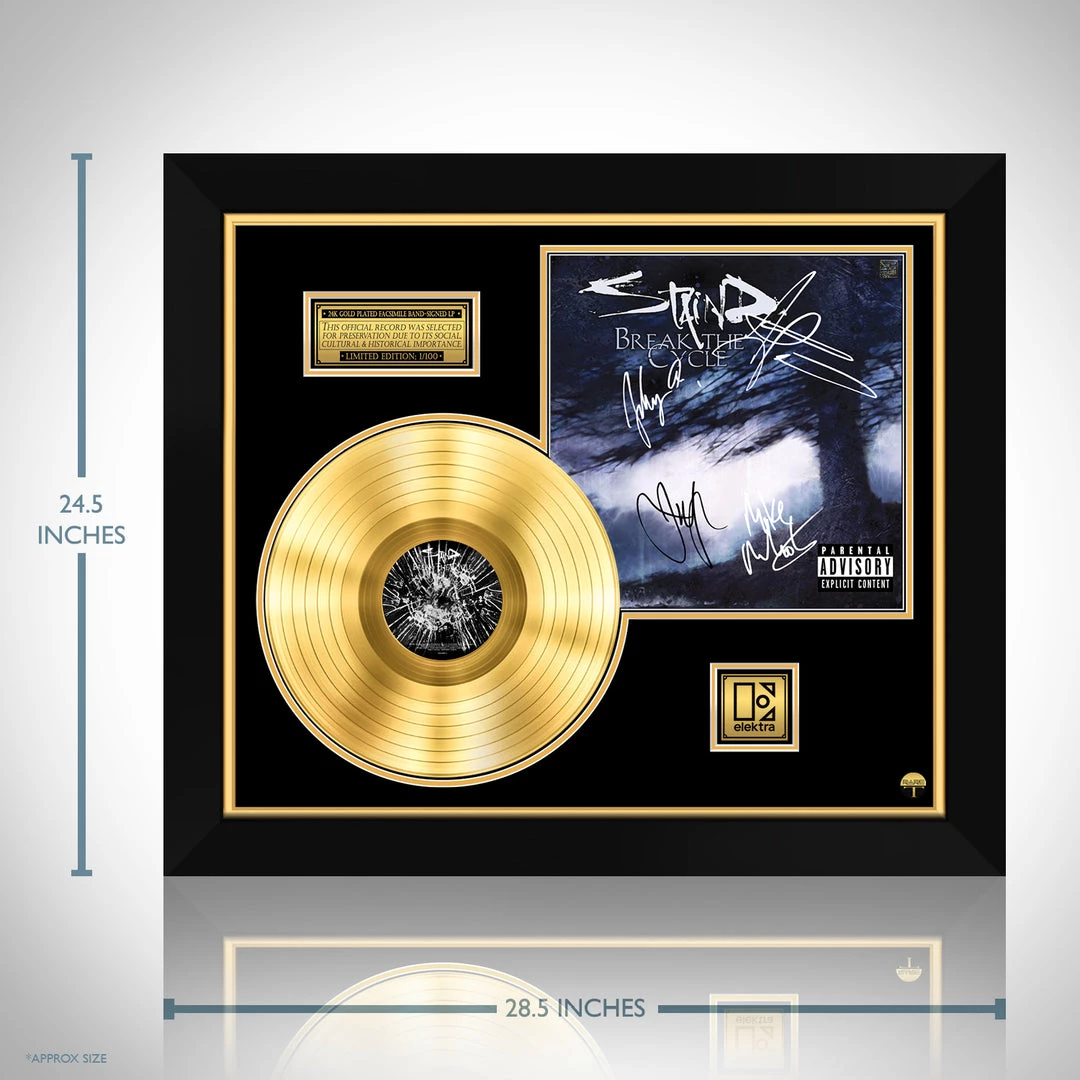 Pay homage to one of the most iconic American rock band of all time Staind , with this gallery-framed, authentic Elecktra Records fully licensed facsimile of the official Hand-Signed 24K Gold LP Record and LP Cover Break the cycle Originally signed by Aaron Lewis, Mike Mushok, Johnny April, Jon Wysocki, , of which is strictly limited to 100 units Worldwide and has been approved and numbered accordingly.
