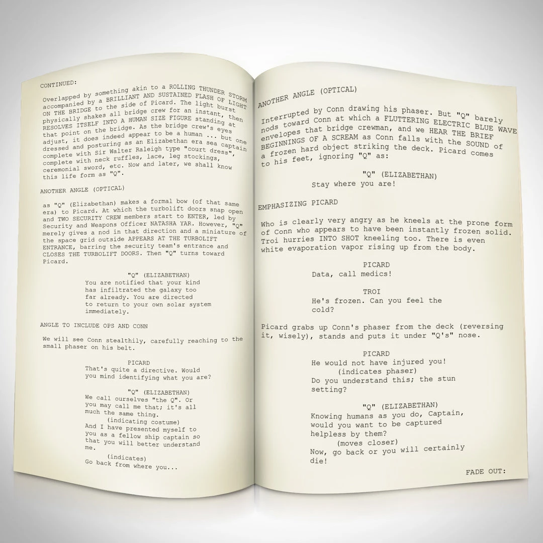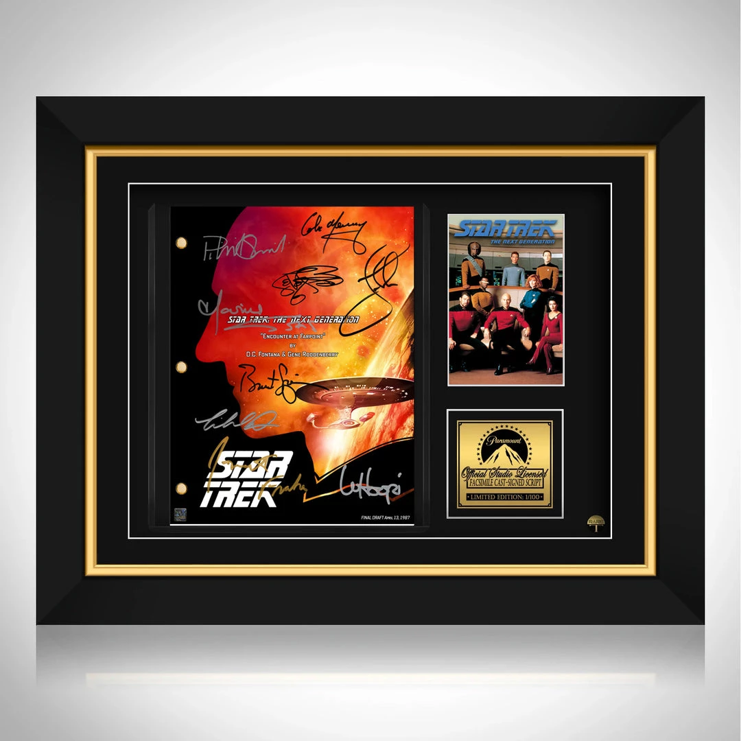 Pay homage to Star Trek The Next Generaition , with this Paramount Pictures  fully licensed facsimile of the official signed TV Series script, originally signed by actors Patrick Stewart, Jonathan Frakes, LeVar Burton, Marina Sirtis, Brent Spiner, Michael Dorn, Colm Meaney, Whoopi Goldberg & John De Lancie , of which is strictly limited to 100 units Worldwide and has been approved and numbered accordingly.