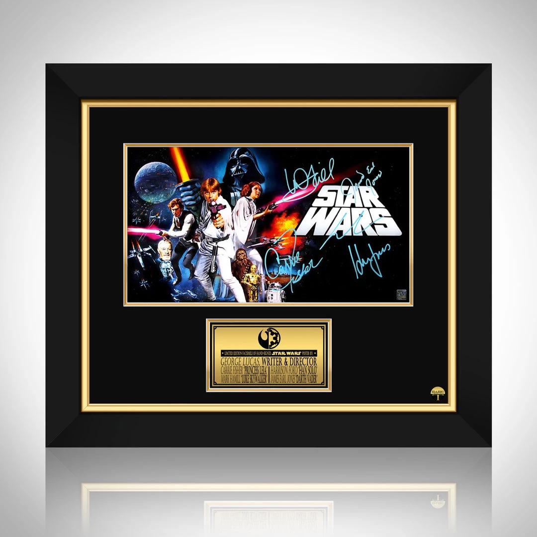 Pay homage to one of the top highest grossing film franchises of all time, Star Wars, with this absolute masterpiece with this gallery-framed, officially licensed, limited edition facsimile of the cast Hand-Signed Star Wars A New Hope movie photo, originally signed by Harrison Ford, Mark Hamill, James Earl Jones, the late great Carrie Fisher & legendary director & writer George Lucas, of which is strictly limited to 100 units Worldwide, and has been approved and numbered accordingly.