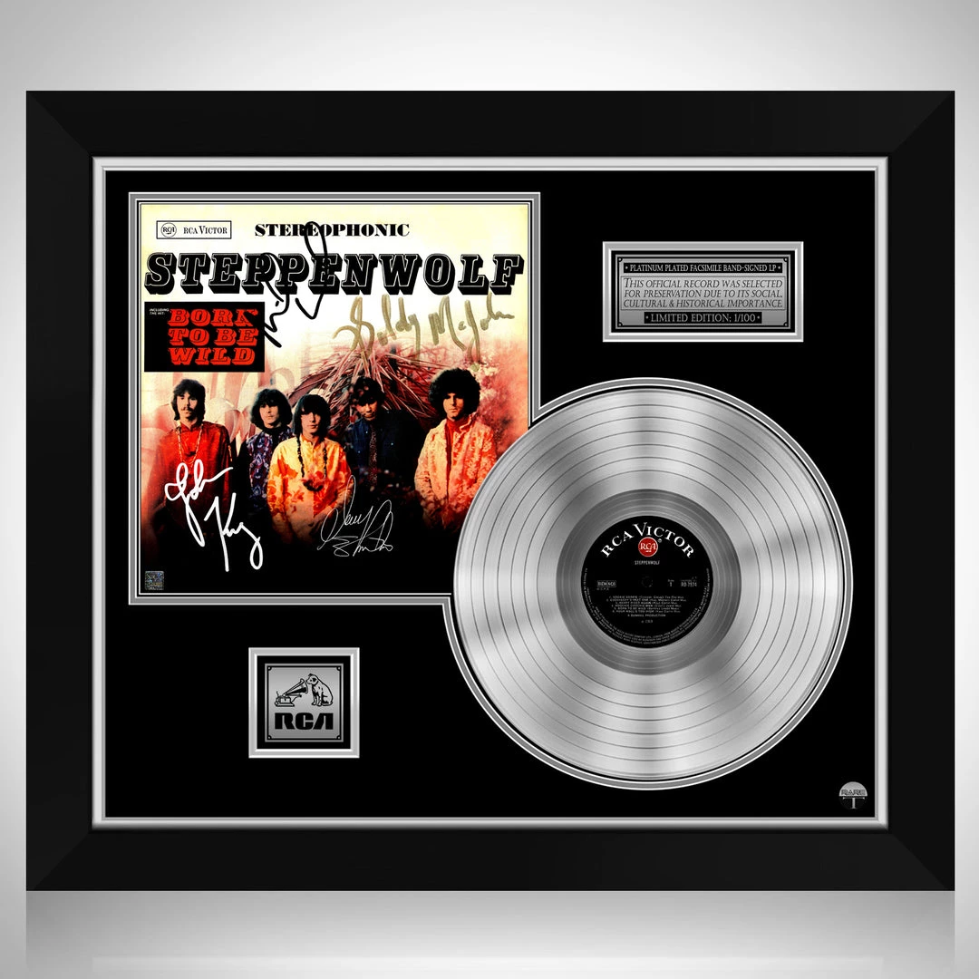 Pay homage to one of the most iconic Canadian-American rock band of all time Steppenwolf , with this gallery-framed, authentic RCA Records fully licensed facsimile of the official Hand-Signed Platinum Plated LP Record and LP Cover self-titled Originally signed by John Kay, Michael Monarch, Goldy McJohn & Jerry Edmonton , of which is strictly limited to 100 units Worldwide and has been approved and numbered accordingly.