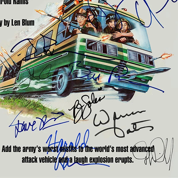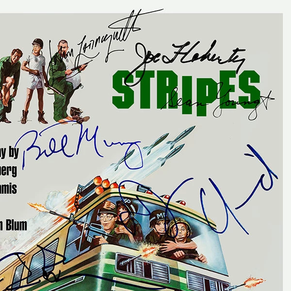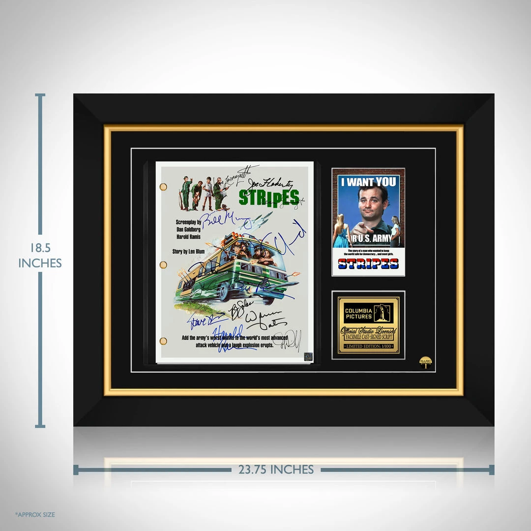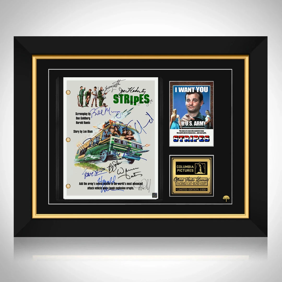 Pay homage to Stripes , with this Columbia Pictures fully licensed facsimile of the official signed movie Transcriptย , originally signed by actors Ivan Reitman, Harold Ramis, Bill Murray, Warren Oates, P.J. soles, Sean Young, John Candy, John Larroquette, judge Reinhold, Joe Flaherty, Dave Thomas, Bill Paxton & Dennis Quaid , of which is strictly limited to 100 units Worldwide and has been approved and numbered accordingly.