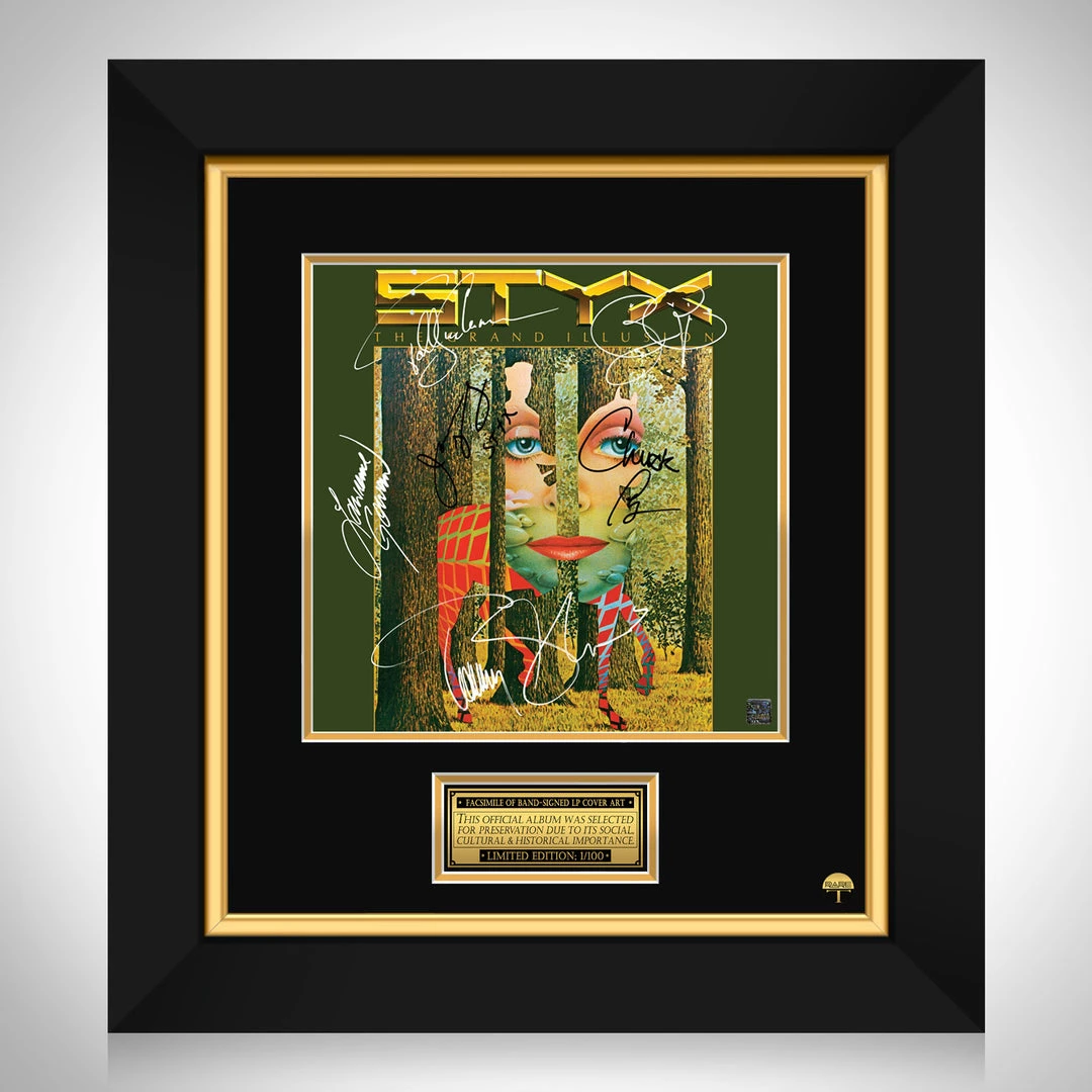 Pay homage to one of the most iconic band of all time, Styx , with this gallery-framed, officially licensed, limited edition facsimile of the Hand-Signed The Grand Illusion LP Cover originally signed by Tommy Shaw, James “JY” Young, Lawrence Gowan, Chuck Panozzo,Todd Sucherman & Ricky Phillips , of which is strictly limited to 100 units Worldwide, and has been approved and numbered accordingly.