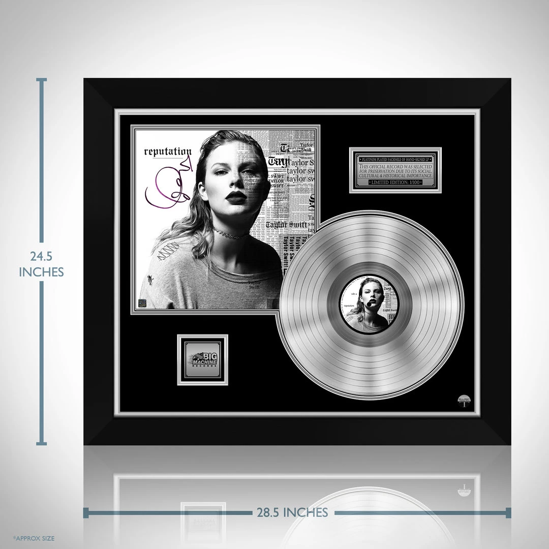 Pay homage to one of the most iconic American singer-songwriter of all time Taylor Swift , with this gallery-framed, authentic Big Machine Records fully licensed facsimile of the official Hand-Signed Platinum Plated LP Record and LP Cover Reputation Originally signed by Taylor Swift , of which is strictly limited to 100 units Worldwide and has been approved and numbered accordingly.