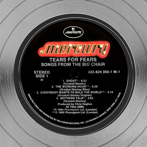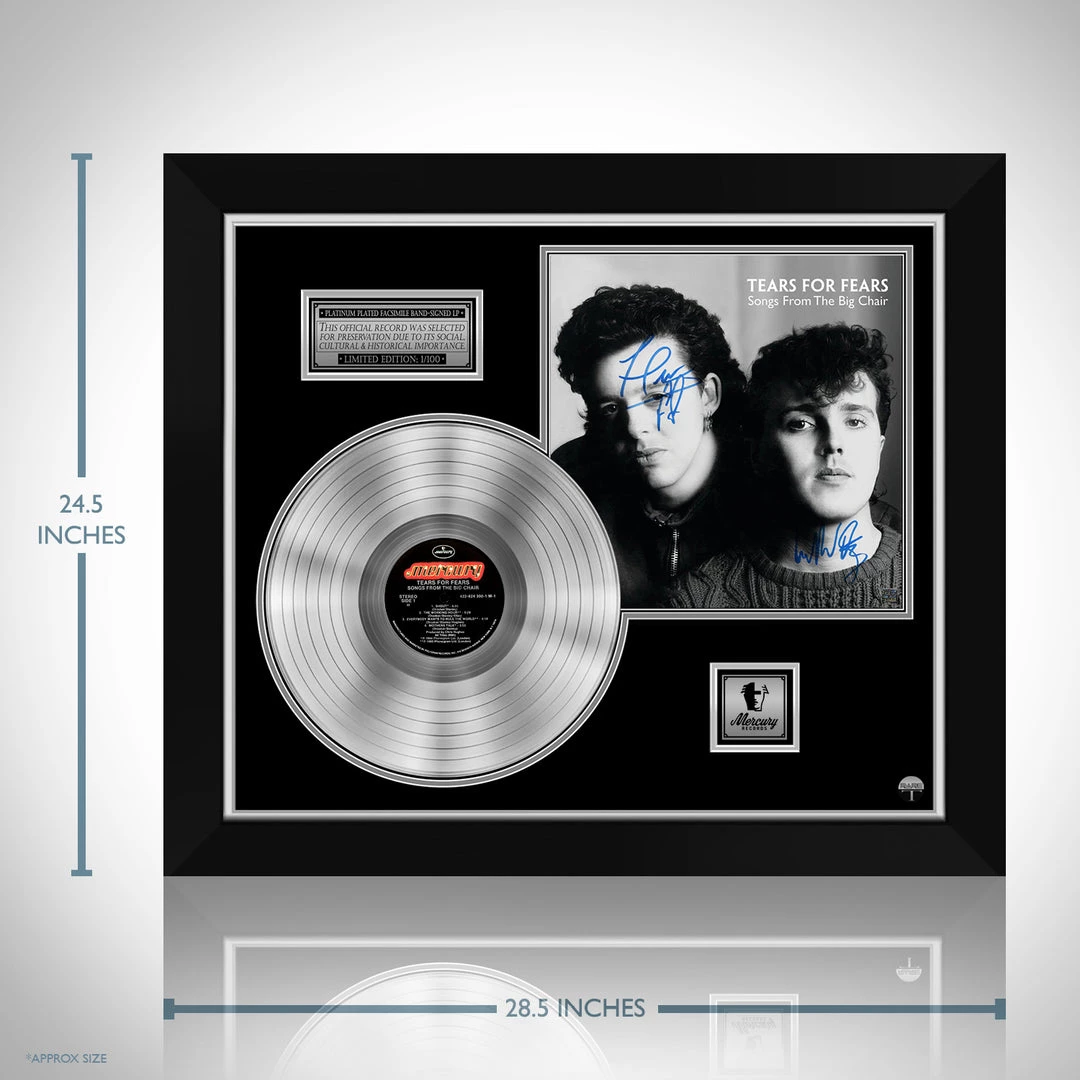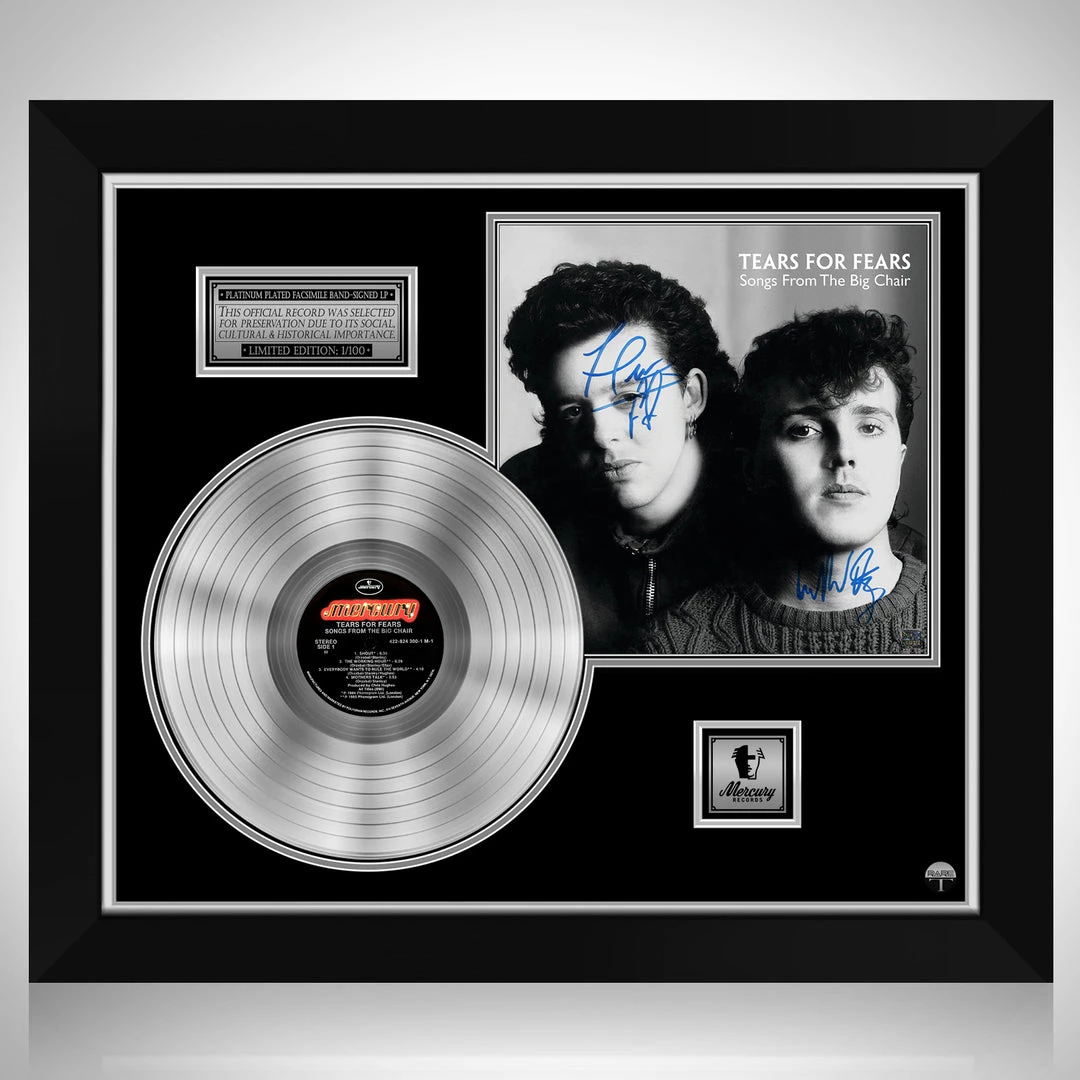 Pay homage to one of the most iconic English pop rock band of all time Tears for Fears , with this gallery-framed, authentic Mercury Records fully licensed facsimile of the official Hand-Signed Platinum Plated LP Record and LP Cover Songs from the big Chair Originally signed by Roland Orzabal & Curt Smith , of which is strictly limited to 100 units Worldwide and has been approved and numbered accordingly.