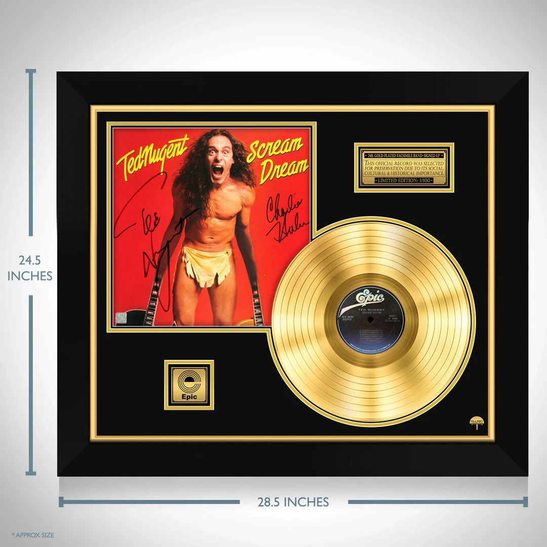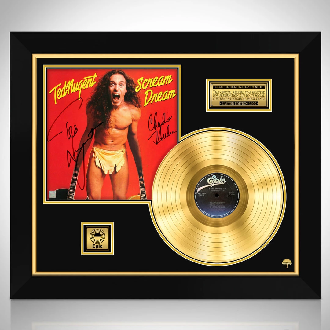 Pay homage to one of the greatest guitar players & Singers of all time, Ted Nugent, with this gallery-framed, authentic, Epic Records fully licensed facsimile of the official Hand-Signed 24k Gold Plated LP Record and LP Cover Scream Dream originally signed by Ted Nugent & Charlie Huhn, of which is strictly limited to 100 units Worldwide and has been approved and numbered accordingly.
