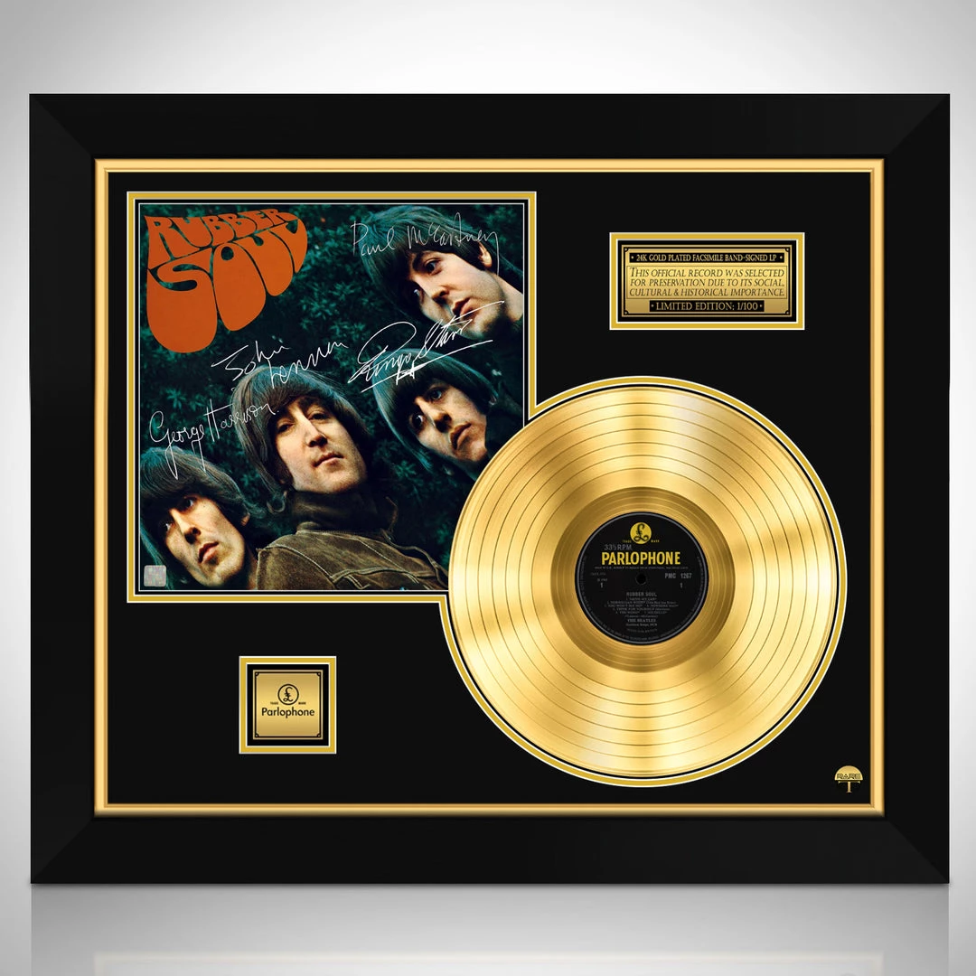 Pay homage to one of the best and most influential Bands of all time The Beatles, with this gallery-framed, authentic, Parlophone Records fully licensed facsimile of the official Hand-Signed 24k Gold Plated LP Record and LP Cover Rubber Soul, originally signed by band members, Paul McCartney, Ringo Starr, the late George Harrison & John Lennon, of which is strictly limited to 100 units Worldwide and has been approved and numbered accordingly.