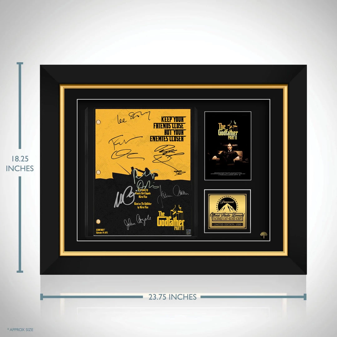 Pay homage to The Godfather 2 , with this Paramount Pictures fully licensed facsimile of the official signed movie script, originally signed by actors Robert De Niro, Francis Ford Coppola, Robert Duvall, Al Pacino, James Caan, John Cazale, Diane Keaton & Lee Strasberg , of which is strictly limited to 100 units Worldwide and has been approved and numbered accordingly.