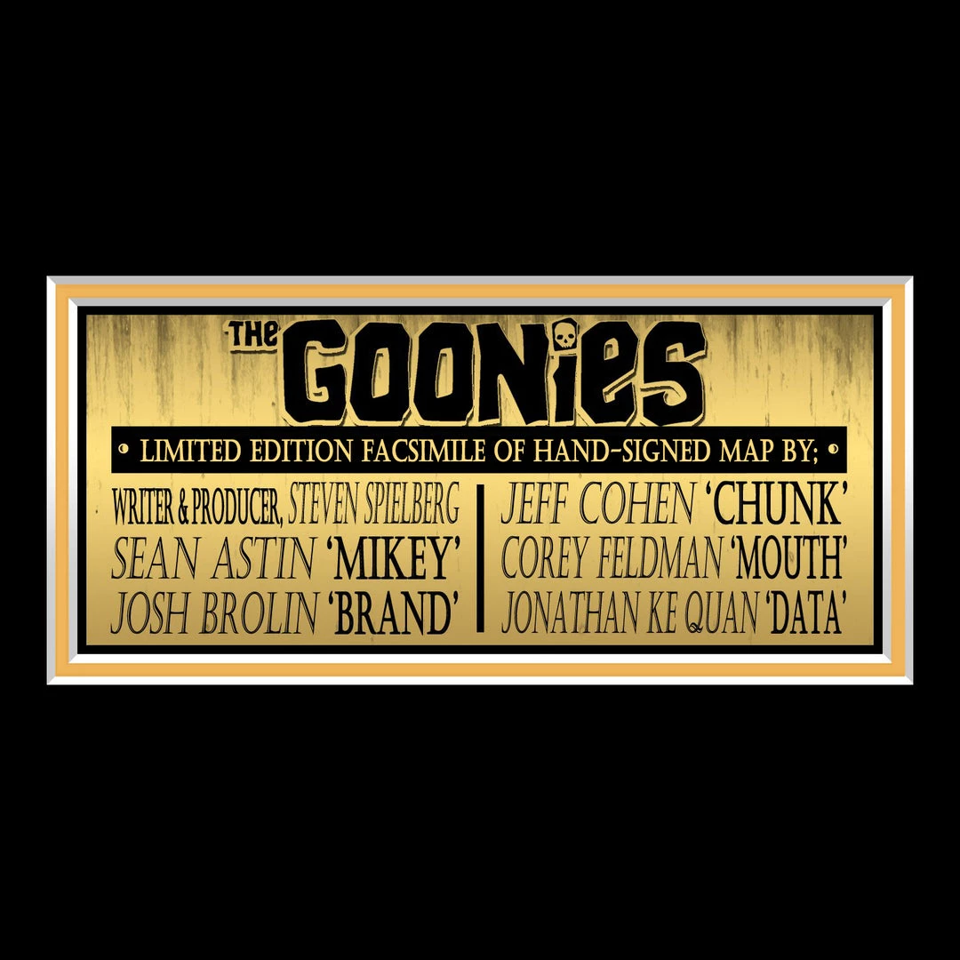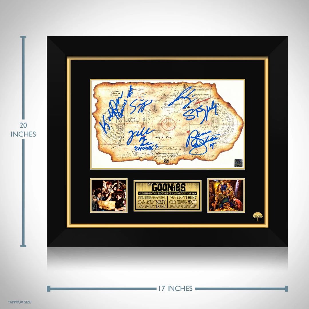 Pay homage to the The Goonies, with this gallery-framed, officially licensed, limited edition facsimile of the Hand-Signed Treasure Map, originally signed by Josh Brolin, Sean Astin, Corey Feldman, Jeff Cohen, Jonathan Ke Quan and by the legendary filmmaker, Steven Spielberg. of which is strictly limited to 100 units Worldwide, and has been approved and numbered accordingly.