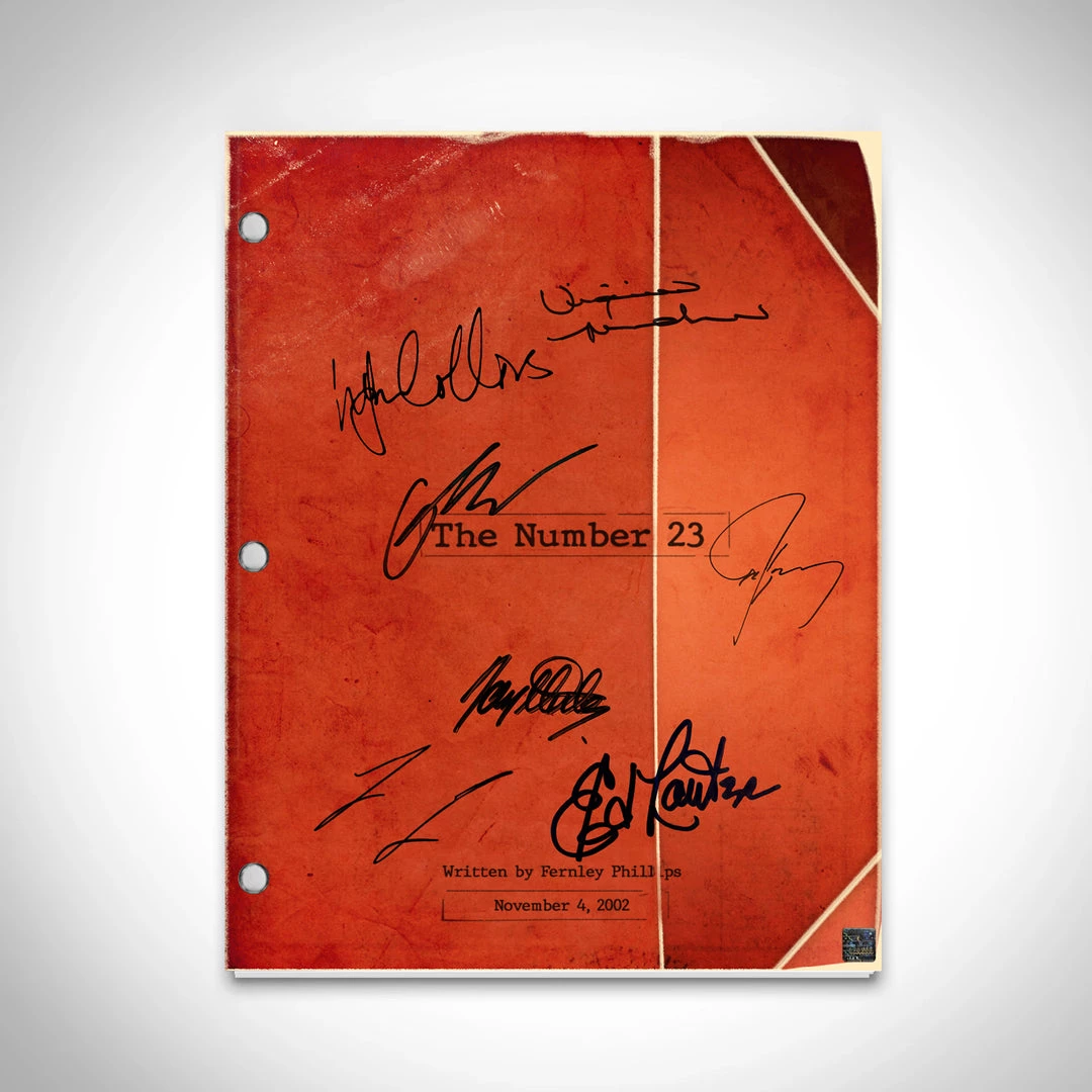 Pay homage to The Number 23 , with this New Line Cinema fully licensed facsimile of the official signed movie script, originally signed by actors Jim Carrey, Virginia Madsen, Logan Lerman, Danny Huston, Lynn Collins, Corey Stoll & Ed Lauter , of which is strictly limited to 100 units Worldwide and has been approved and numbered accordingly.