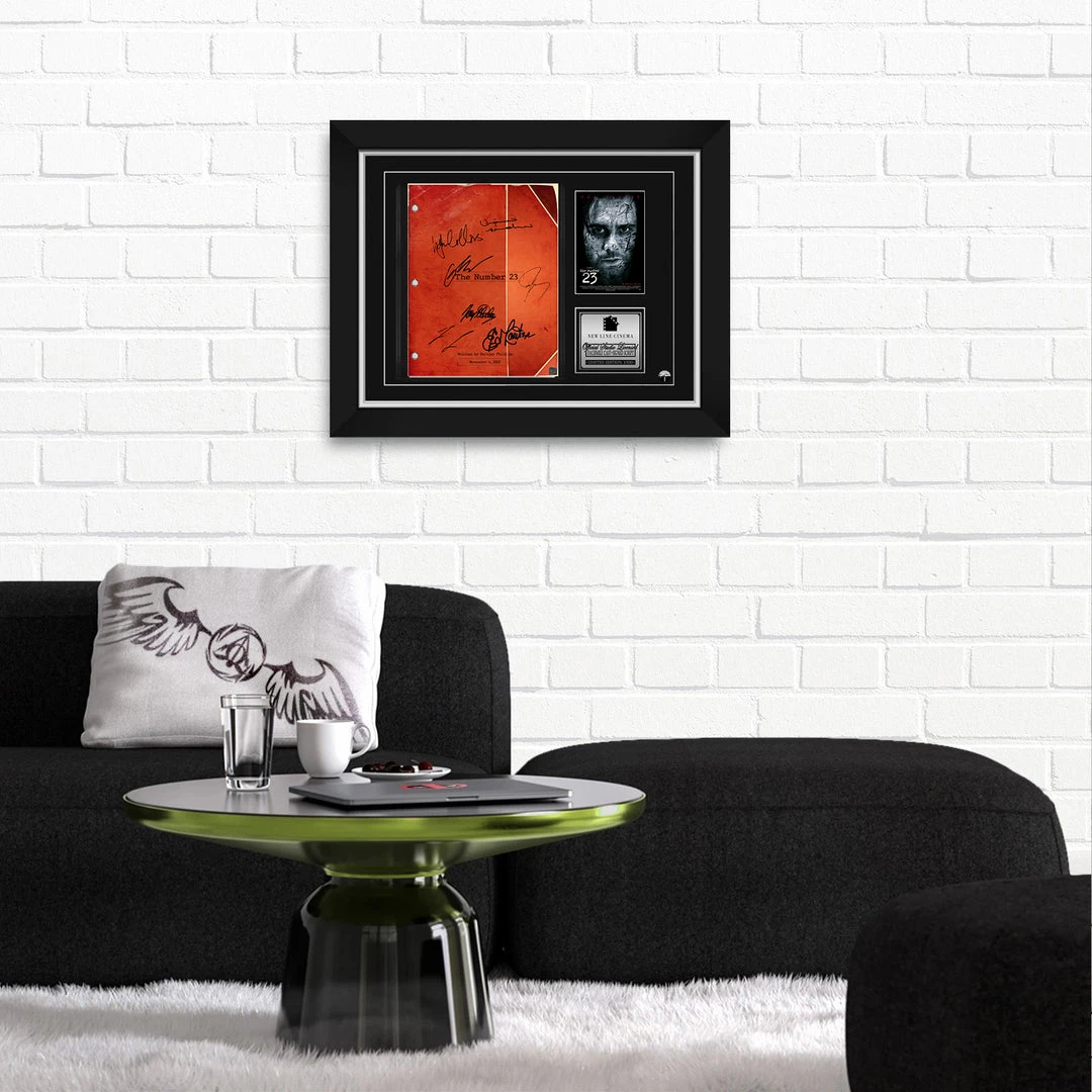 — Collector Grade Proprietary Exclusive VELVET TOUCH water/scratch resistant cover. — Collectible Facsimile of Original Hand-Signed The Number 23 movie Script Custom Frame.