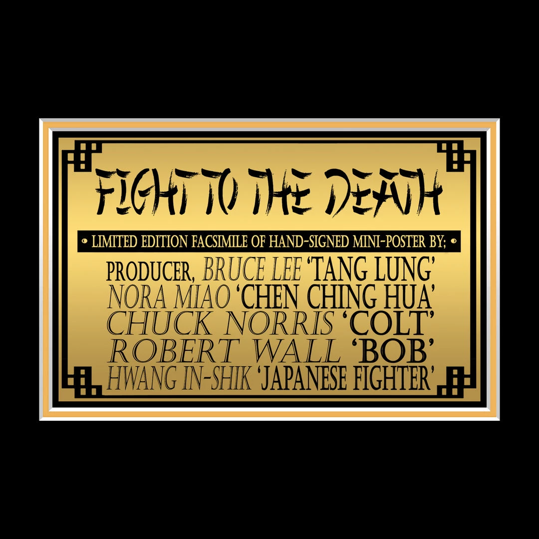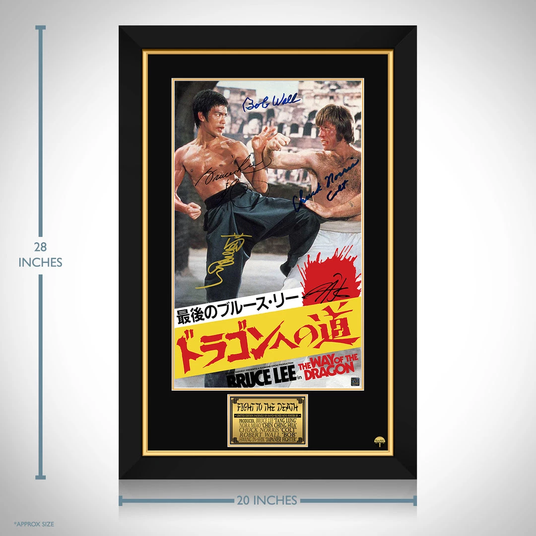 Pay homage to one of the most iconic film of all time, The Way Of The Dragonย , with this gallery-framed, officially licensed, limited edition facsimile of hand-signed movie mini poster, originally signed by Bruce Lee, Nora Miao, Chuck Norris, Robert Wall & Hwang In-Shik, of which is strictly limited to 100 units Worldwide, and has been approved and numbered accordingly.