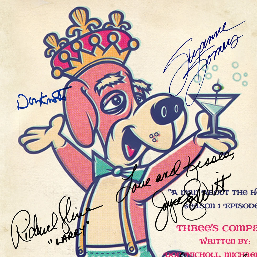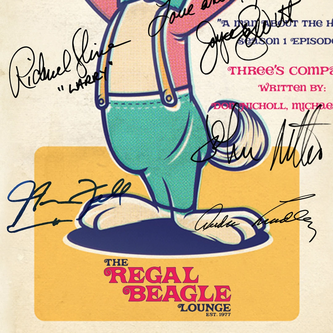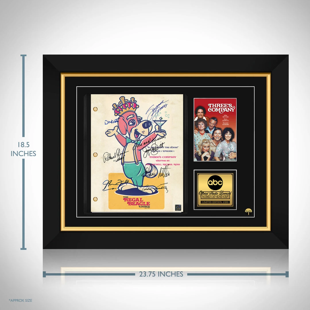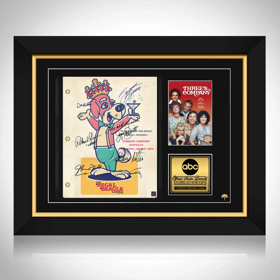 Pay homage to Three’s Company , with this ABC fully licensed facsimile of the official signed TV Series script, originally signed by actors John Ritter, Joyce DeWitt, Richard Kline, Din Knotts, Suzanne Somers, Audra Lindley & Norman Fell , of which is strictly limited to 100 units Worldwide and has been approved and numbered accordingly.