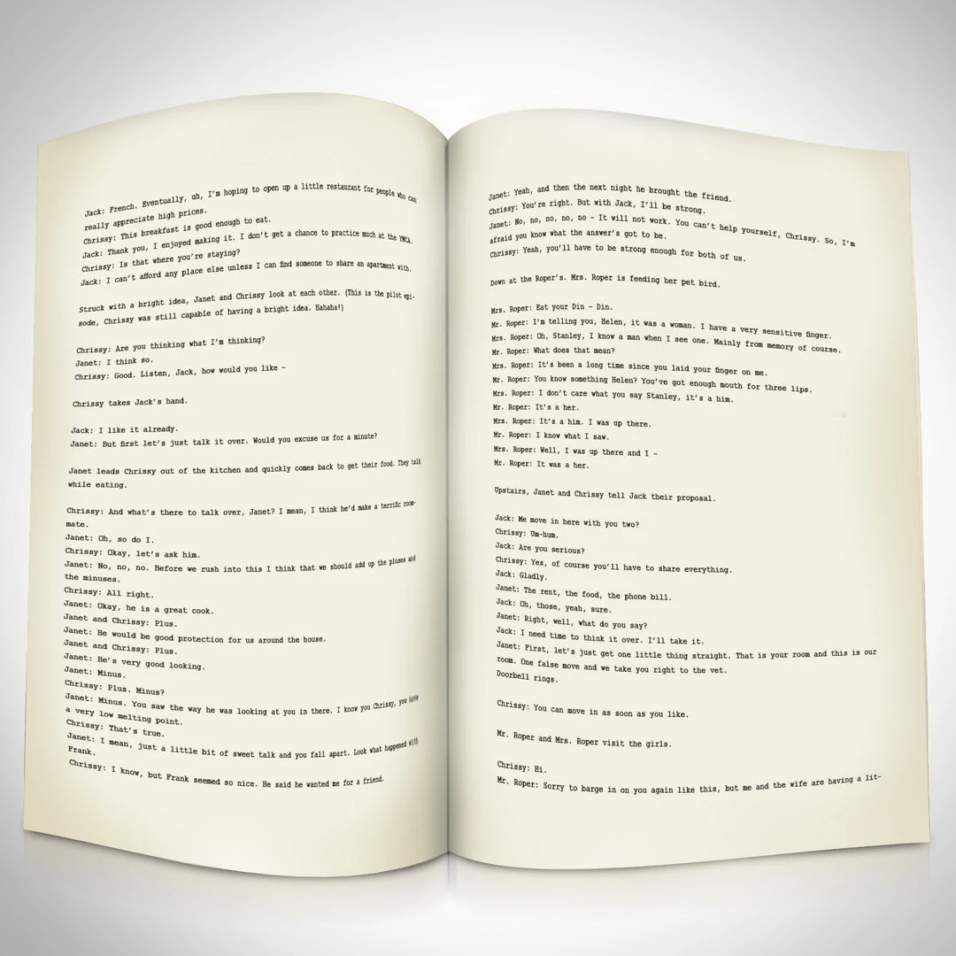 — Collector Grade Proprietary Exclusive VELVET TOUCH water/scratch resistant cover. — Collectible Facsimile of Original Hand-Signed Three’s Company TV Series Script Custom Frame.