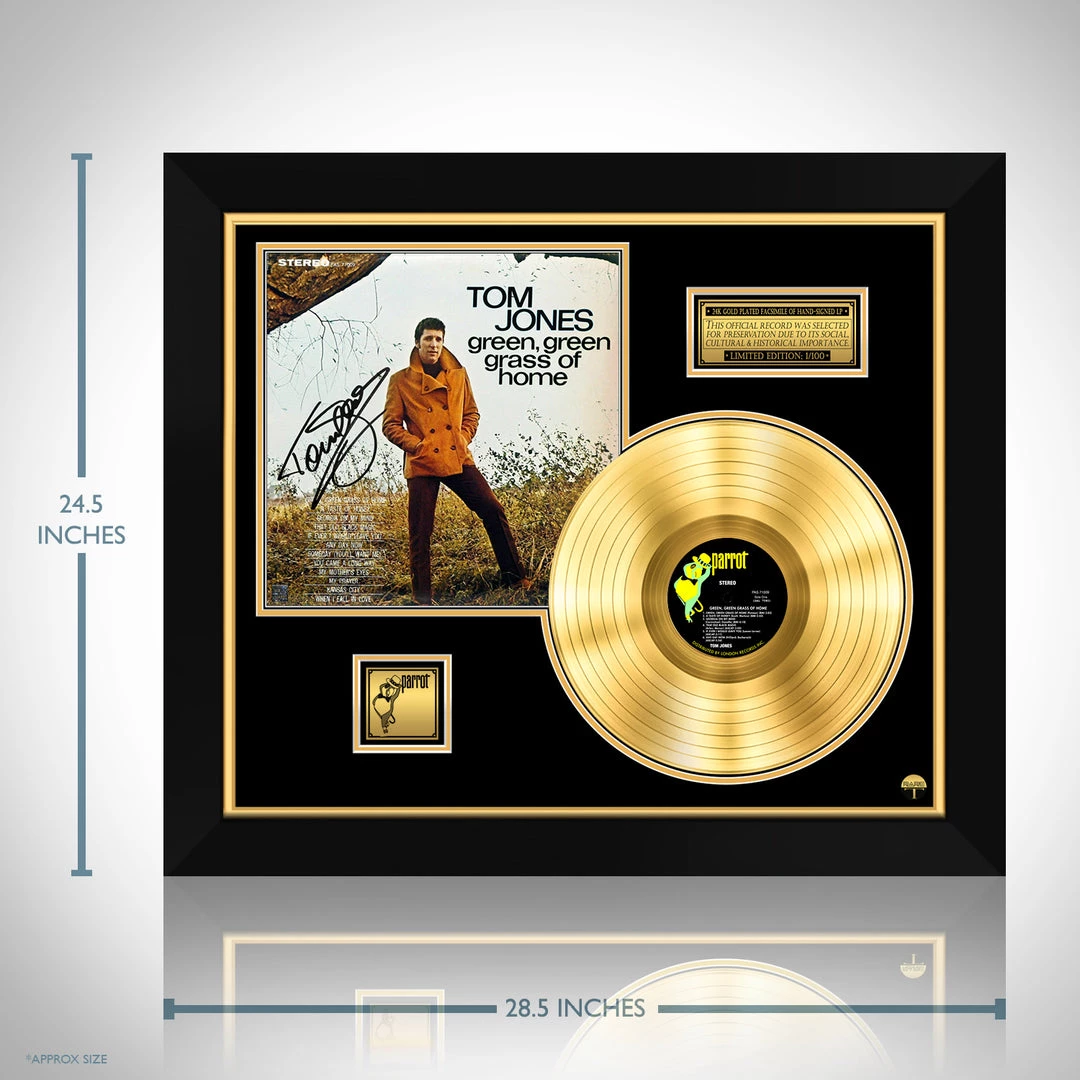 Pay homage to one of the most iconic Welsh singer of all time Tom Jones , with this gallery-framed, authentic Parrot Records fully licensed facsimile of the official Hand-Signed 24K Gold LP Record and LP Cover Green, Green, Grass of Home Originally signed by Tom Jones , of which is strictly limited to 100 units Worldwide and has been approved and numbered accordingly.