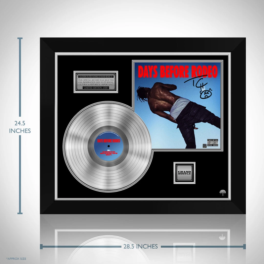 Pay homage to one of the most iconic American rapper, singer, songwriter of all time Travis Scott , with this gallery-framed, authentic Grand Hustle Records fully licensed facsimile of the official Hand-Signed Platinum Plated LP Record and LP Cover Days Before Rodeo Originally signed by Jacques Bermon Webster II “Travis Scott” , of which is strictly limited to 100 units Worldwide and has been approved and numbered accordingly.