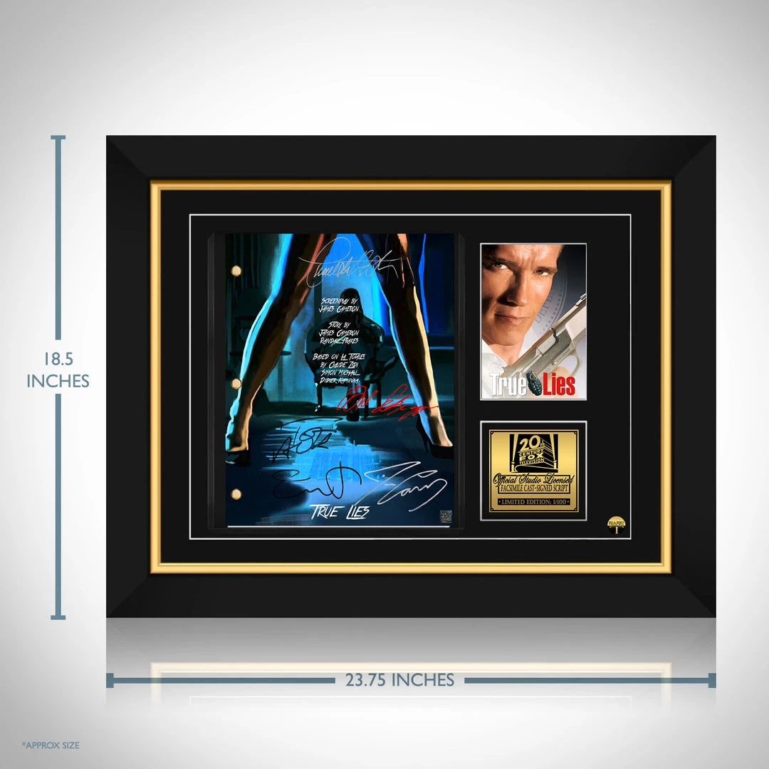 Pay homage to True Lies , with this 20th Century Fox fully licensed facsimile of the official signed movie script, originally signed by James Cameron, Arnold Schwarzenegger, Jamie Lee Curtis, Tom Arnold, Bill Paxton & Charlton Heston , of which is strictly limited to 100 units Worldwide and has been approved and numbered accordingly.