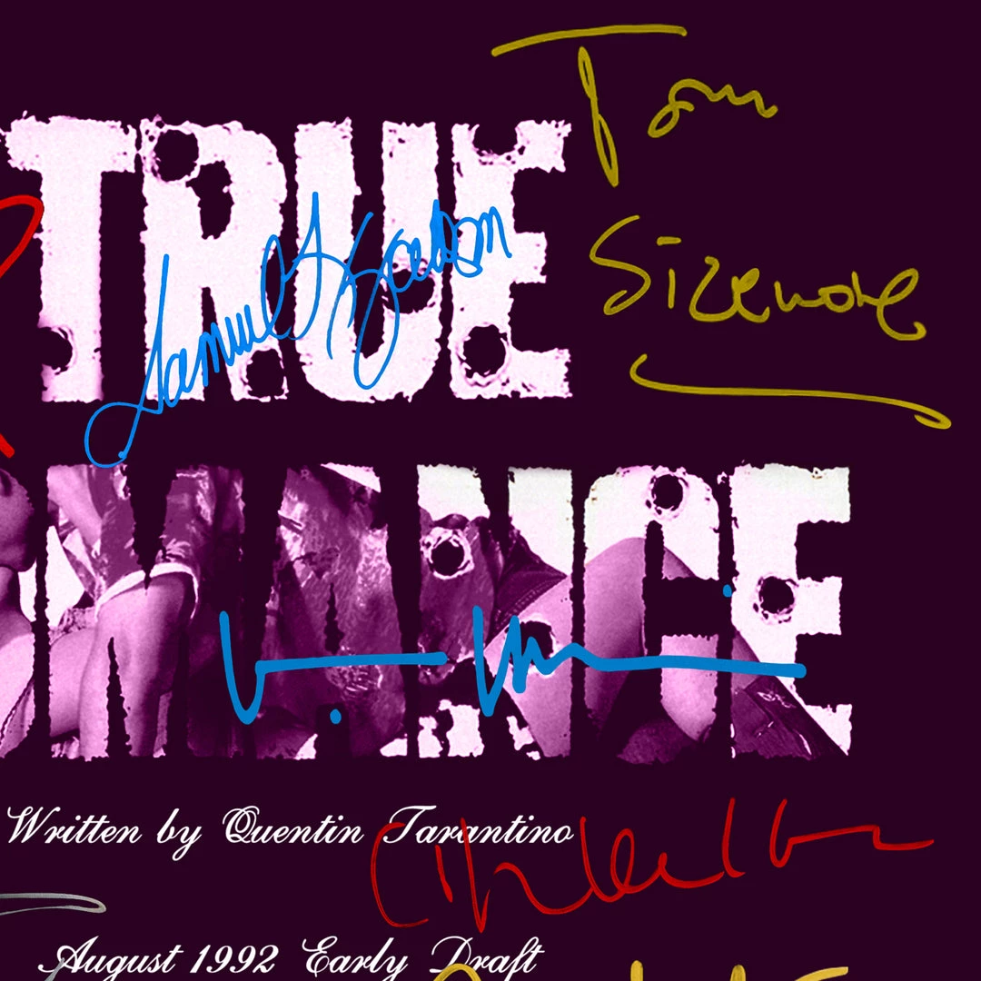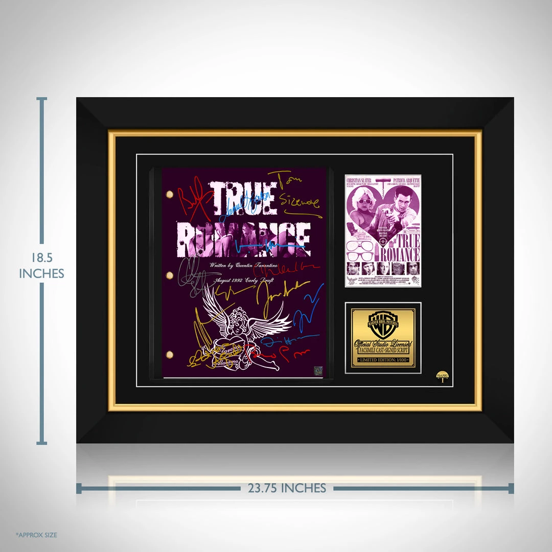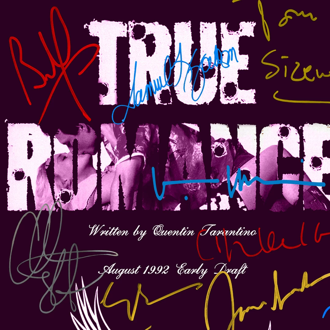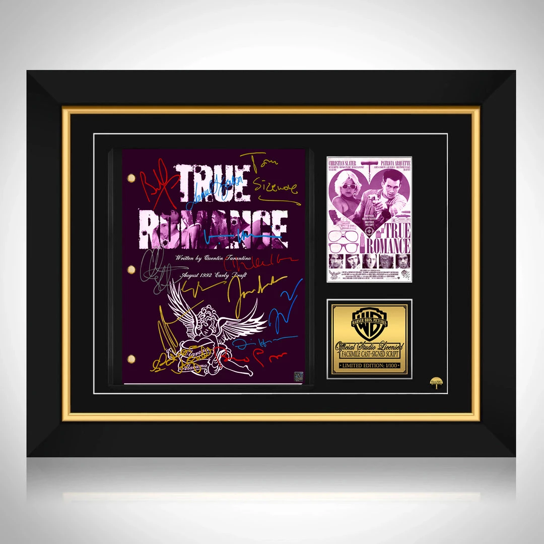 Pay homage to True Romance , with this Warner Bros fully licensed facsimile of the official signed movie script, originally signed by actors Quentin Tarantino, Harvey Weinstein, Christian Slater, Patricia Arquette, Dennis Hopper, Val Kilmer, Gary Oldman, Brad Pitt, Christopher Walken, Samuel L.Jackson, James Gandolfini, Tom Sizemore & Bronson Pinchot , of which is strictly limited to 100 units Worldwide and has been approved and numbered accordingly.