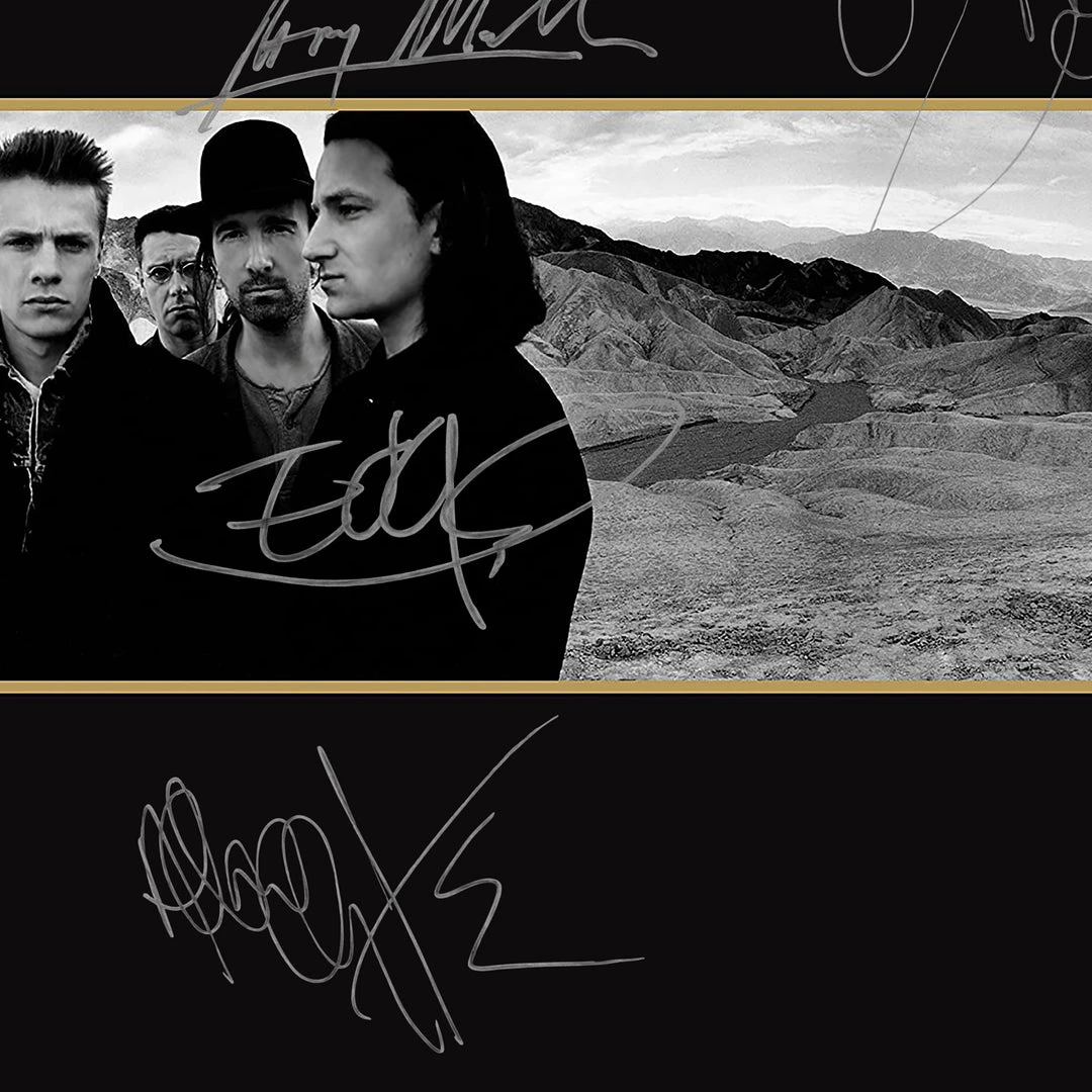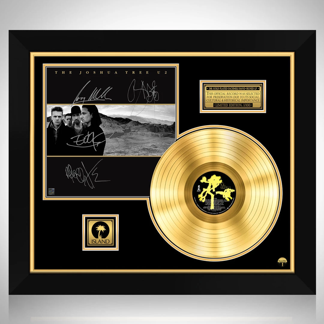 Pay homage to one of the most iconic Irish rock band of all time U2 , with this gallery-framed, authentic Island records fully licensed facsimile of the official Hand-Signed 24K Gold Plated LP Record and LP Cover The Joshua Tree Originally signed by Bono, The Edge, Adam Clayton & Larry Mullen , of which is strictly limited to 100 units Worldwide and has been approved and numbered accordingly.