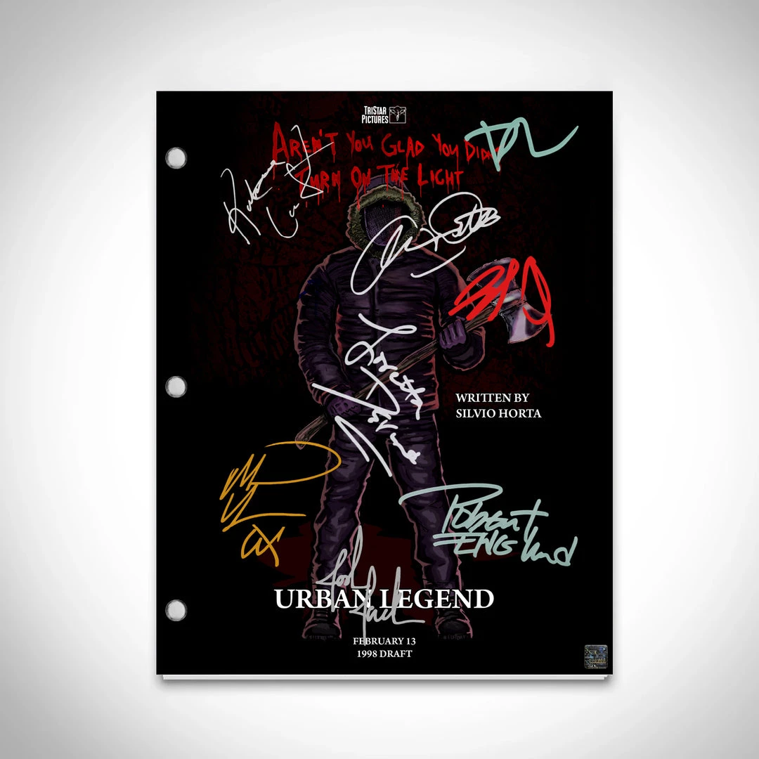 Pay homage to Urban Legend , with this TriStar Pictures fully licensed facsimile of the official signed movie script, originally signed by actors Jared Leto, Alicia Witt, Rebecca Gayheart, Joshua Jackson, Loretta Devine, Tara Reid, Michael Rosenbaum, Robert Englund & Brad Dourif , of which is strictly limited to 100 units Worldwide and has been approved and numbered accordingly.