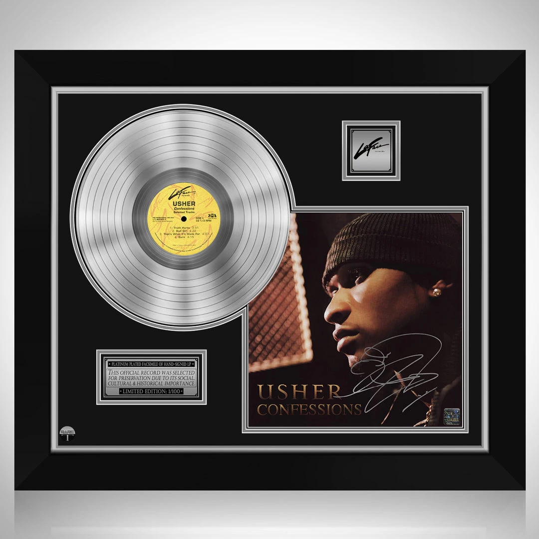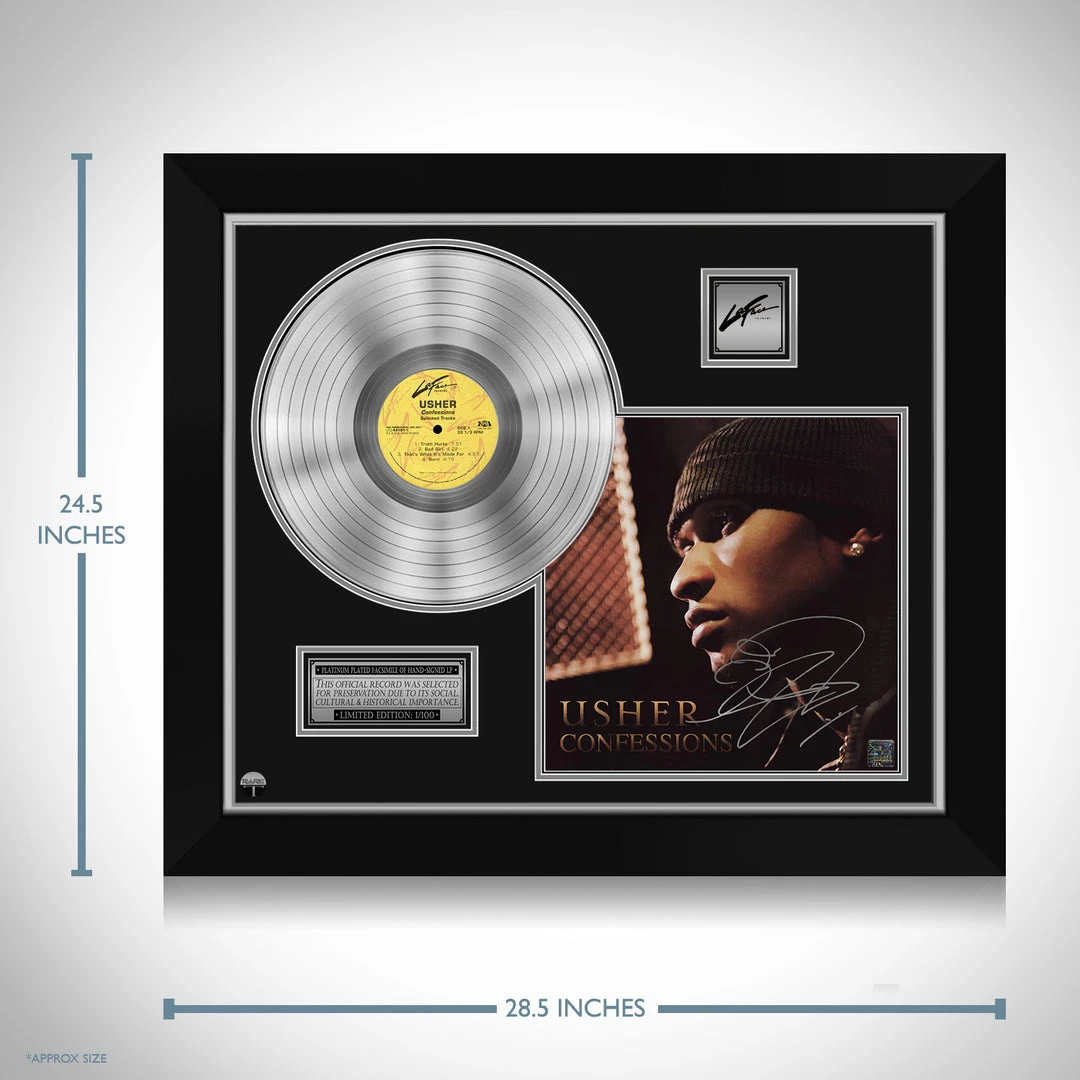 Pay homage to one of the most iconic American singer songwriter of all time Usher , with this gallery-framed, authentic Laface records fully licensed facsimile of the official Hand-Signed Platinum Plated LP Record and LP Cover Confessions Originally signed by Usher Raymond , of which is strictly limited to 100 units Worldwide and has been approved and numbered accordingly.