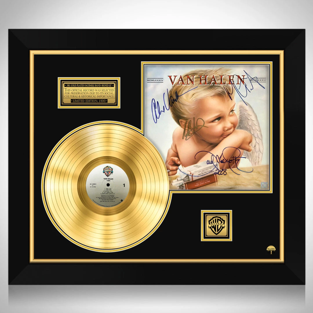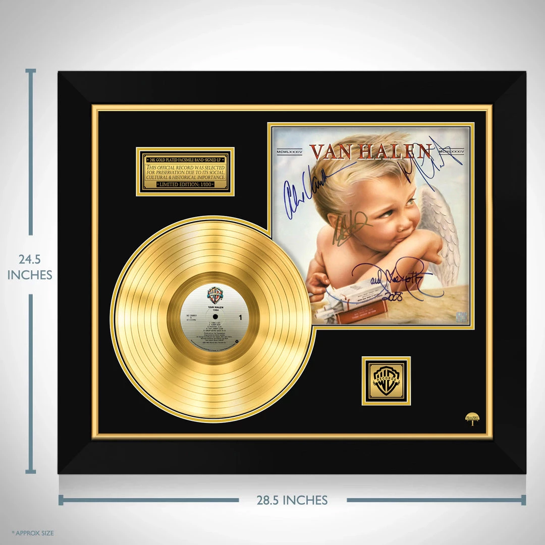 Pay homage to one of the best selling and influential rock bands of all time, Van Halen, with this gallery-framed, authentic, Warner Bros. Records fully licensed facsimile of the official Hand-Signed 24k Gold Plated LP Record and LP Cover 1984 originally signed by the 4 original band members, Eddie Van Halen, Alex Van Halen, David Lee Roth & Michael Anthony, of which is strictly limited to 100 units Worldwide and has been approved and numbered accordingly.