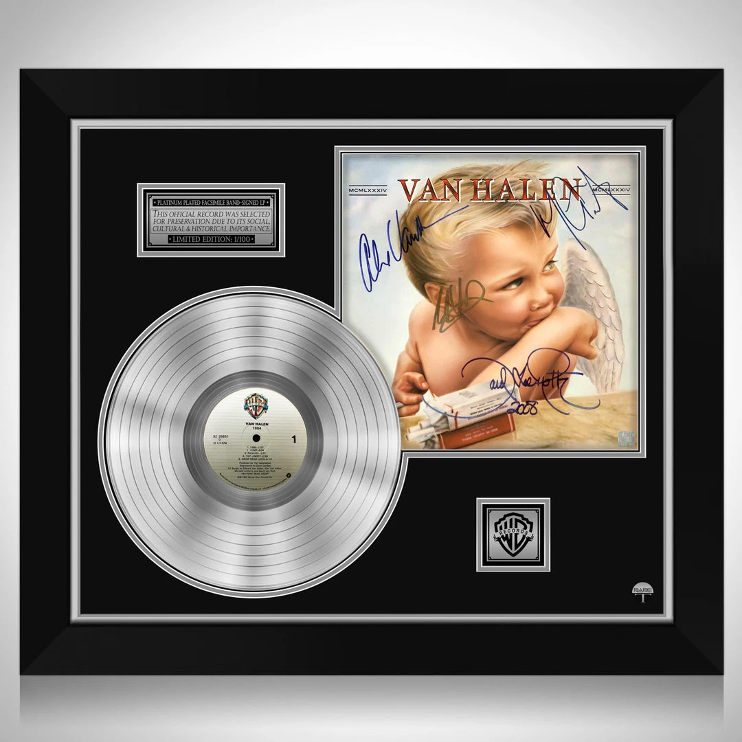 Pay homage to one of the best selling and influential rock bands of all time, Van Halen, with this gallery-framed, authentic, Warner Bros. Records fully licensed facsimile of the official Hand-Signed Platinum Plated LP Record and LP Cover 1984 originally signed by the 4 original band members, Eddie Van Halen, Alex Van Halen, David Lee Roth & Michael Anthony, of which is strictly limited to 100 units Worldwide and has been approved and numbered accordingly.