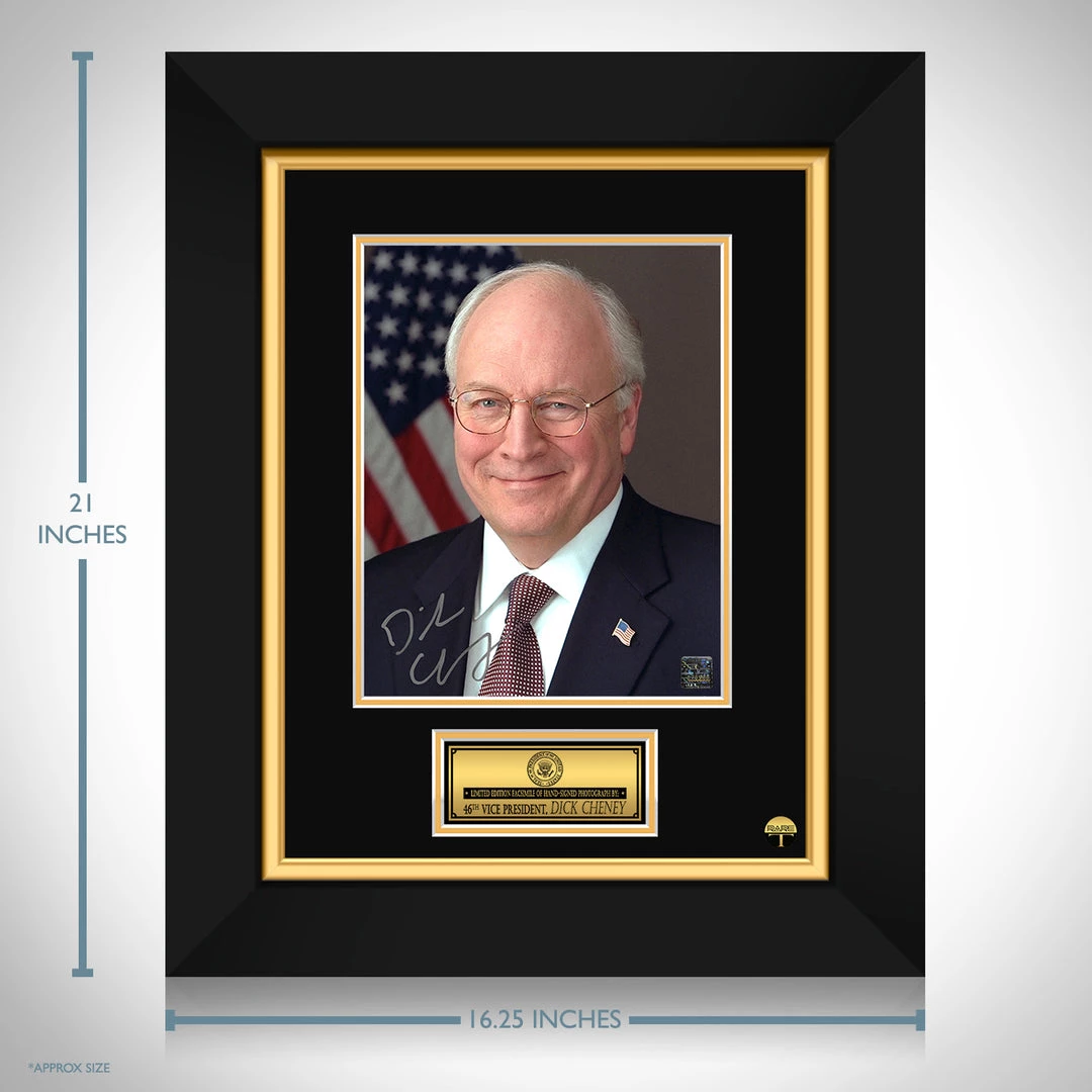 Pay homage to Vice President Dick Cheney, with this gallery-framed, officially licensed, limited edition facsimile of hand-signed promo photo, originally signed by 46th Vice President, Dick Cheney, of which is strictly limited to 100 units Worldwide, and has been approved and numbered accordingly.