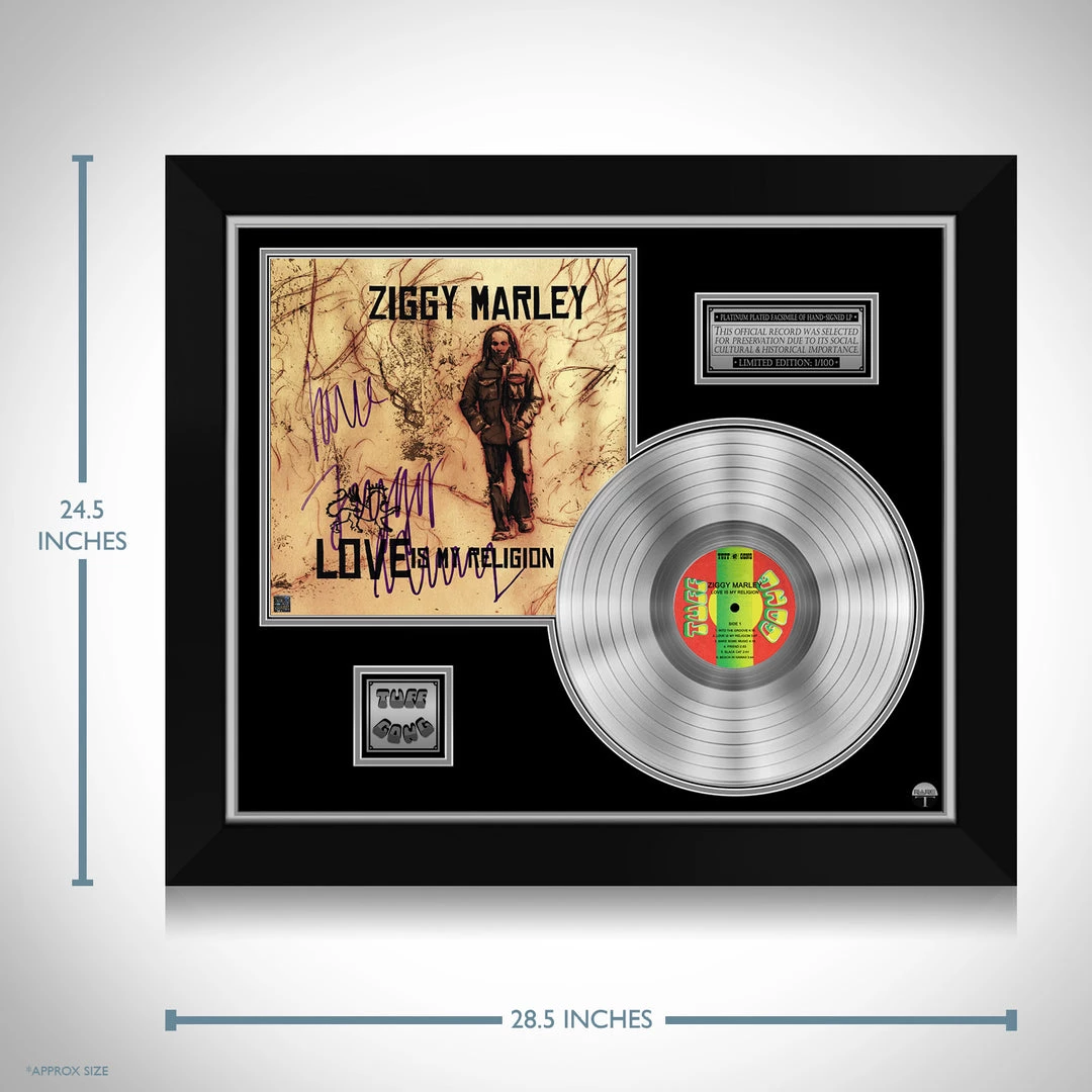 Pay homage to one of the most iconic Jamaican musician of all time Ziggy Marley , with this gallery-framed, authentic Tuff Gong Records fully licensed facsimile of the official Hand-Signed Platinum Plated LP Record and LP Cover Love Is My Religion Originally signed by Ziggy Marley , of which is strictly limited to 100 units Worldwide and has been approved and numbered accordingly.