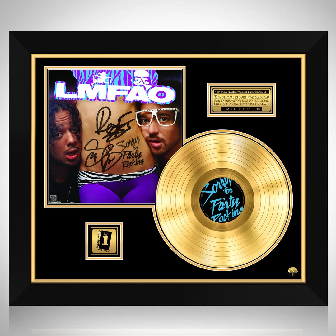 Pay homage to one of the most iconic electronic dance music duo of all time LMFAO , with this gallery-framed, authentic Interscope Record fully licensed facsimile of the official Hand-Signed 24K Gold LP Record and LP Cover Sorry for Party Rocking Originally signed by Stephen Kendal Gordy “RedFoo” & Skyler Austen Gordy “Sky Blu” , of which is strictly limited to 100 units Worldwide and has been approved and numbered accordingly.