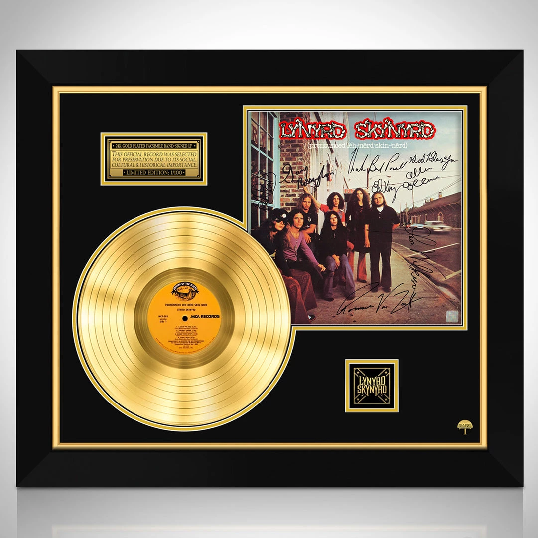 Pay homage to one of the most, influential Southern Style Rock Bands of all time, Lynyrd Skynyrd with this gallery-framed, authentic, MCA fully licensed facsimile of the official Hand-Signed 24k Gold Plated LP Record and LP Cover Pronounced LŽ?h-‘n??rd ‘Skin-‘n??rd originally signed by band members such as lead vocalist Ronnie Van Zant, guitarist Gary Rossington & guitarist Allen Collins, of which is strictly limited to 100 units Worldwide and has been approved and numbered accordingly.