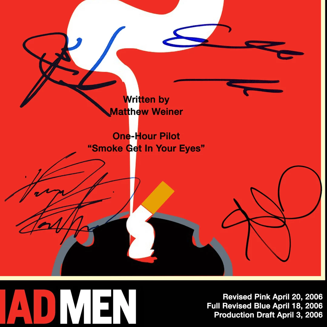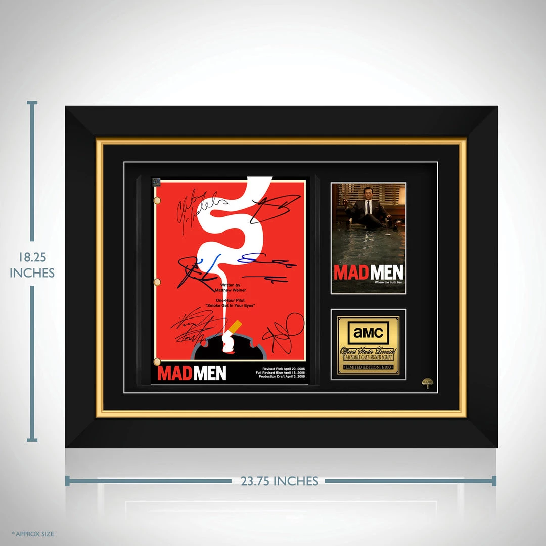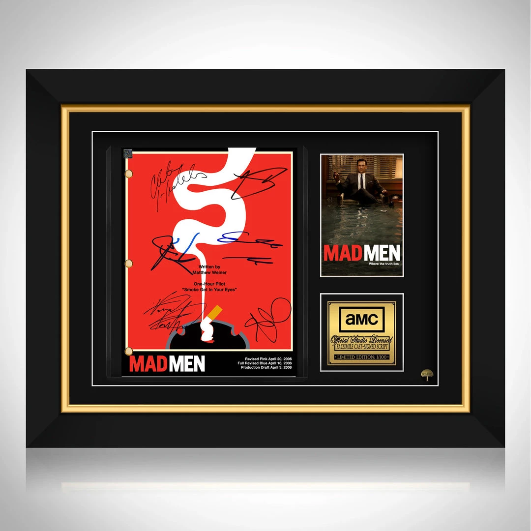 Pay homage to Mad Men , with this AMCย fully licensed facsimile of the official signed TV Series script, originally signed by actors Jon Hamm, Elisabeth Moss, Christina Hendricks, John Slattery, Vincent Kartheiser & January Jones , of which is strictly limited to 100 units Worldwide and has been approved and numbered accordingly.