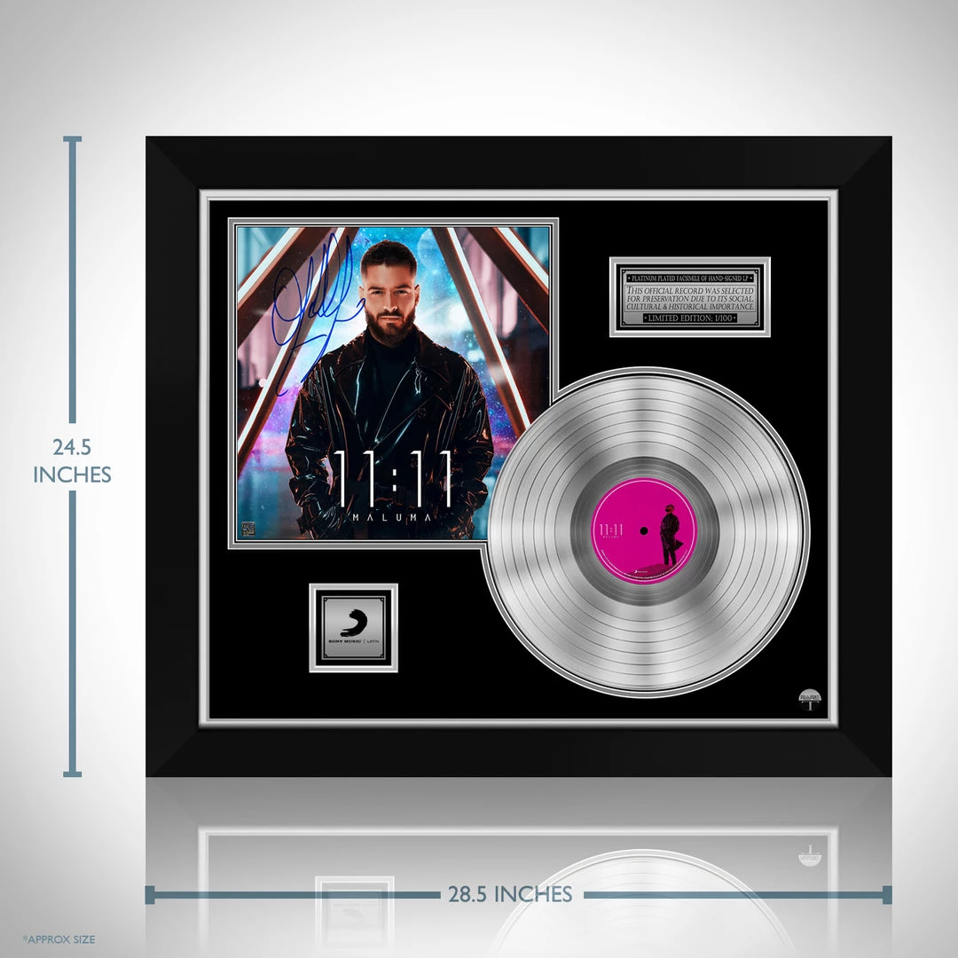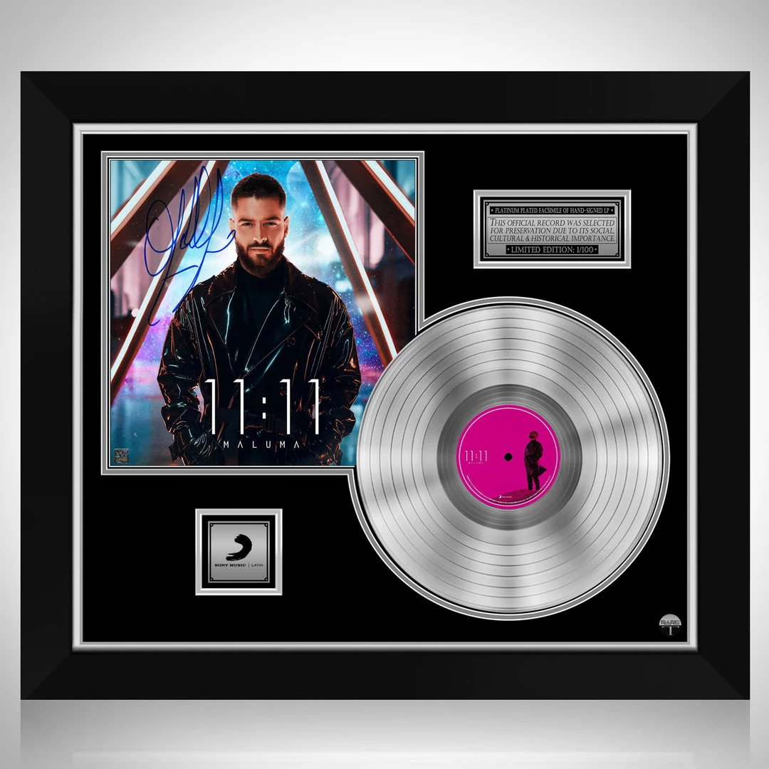 Pay homage to one of the most iconic Colombian singer, songwriter of all time Maluma , with this gallery-framed, authentic Sony Music fully licensed facsimile of the official Hand-Signed Platinum Plated LP Record and LP Cover 11.11 Originally signed by Maluma , of which is strictly limited to 100 units Worldwide and has been approved and numbered accordingly.