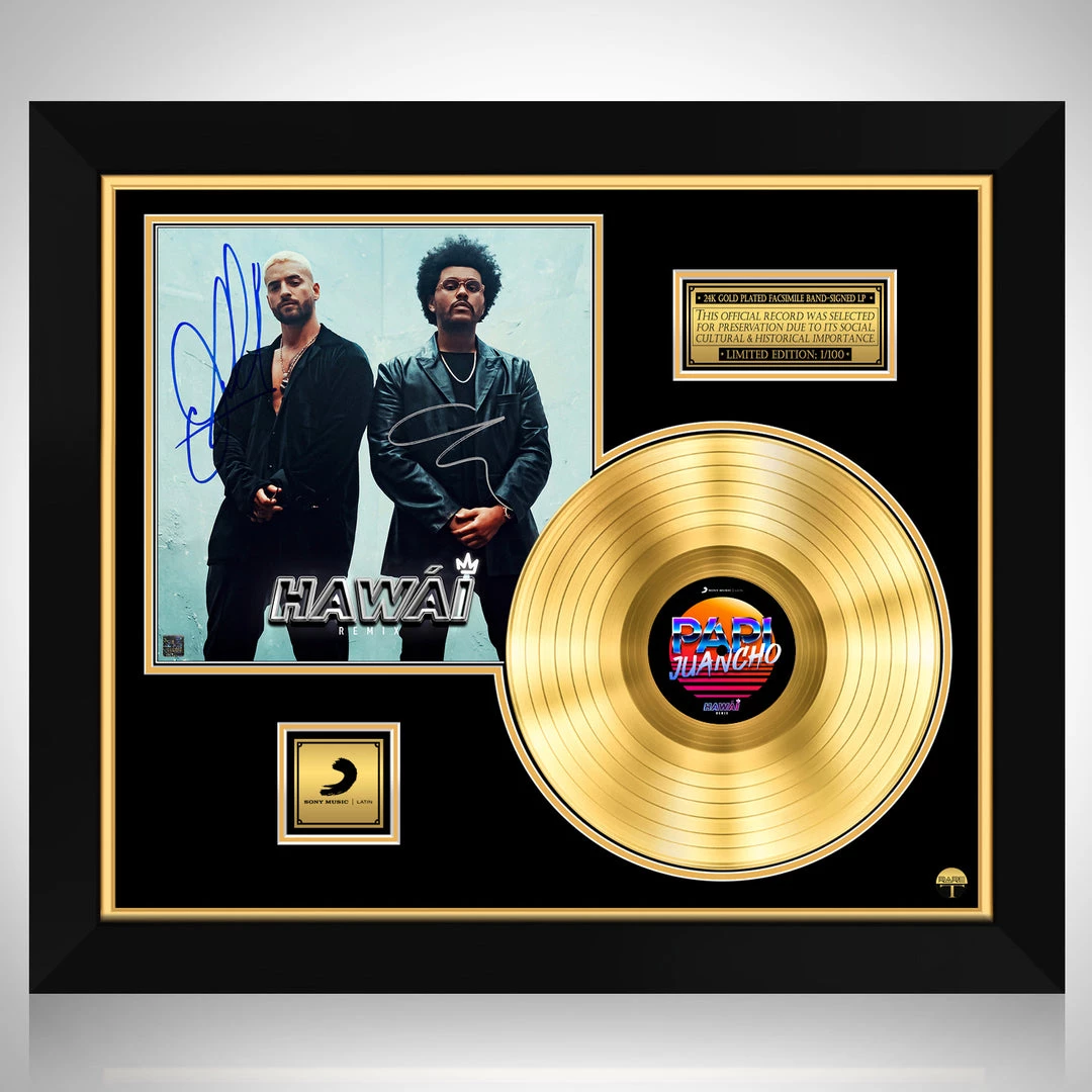 Pay homage to one of the most iconic Colombian singer and Canadian singer of all time Maluma and The Weeknd , with this gallery-framed, authentic Sony Music Latin fully licensed facsimile of the official Hand-Signed 24K Gold LP Record and LP Cover Papi Juancho Hawai Remix Originally signed by Maluma and The Weeknd , of which is strictly limited to 100 units Worldwide and has been approved and numbered accordingly.