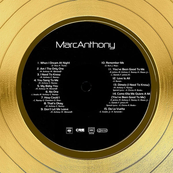 Pay homage to one of the most iconic musician of all time Marc Anthony , with this gallery-framed, authentic Columbia records fully licensed facsimile of the official Hand-Signed 24K Gold LP Record and LP Cover Self titled Originally signed by Marc Anthony , of which is strictly limited to 100 units Worldwide and has been approved and numbered accordingly.