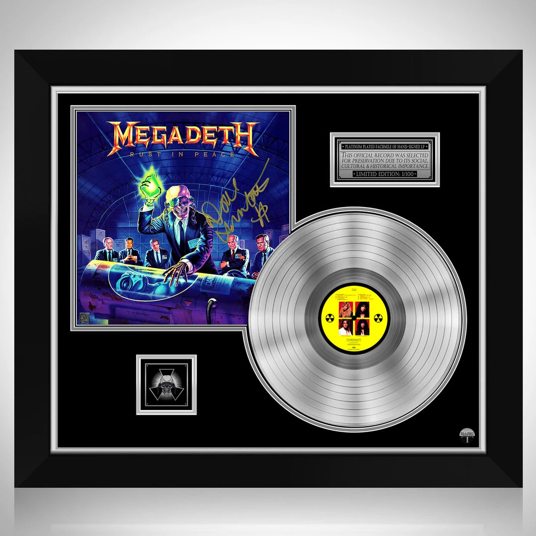 Pay homage to Megadeth , with this gallery-framed, authentic Capitol Records fully licensed facsimile of the official Hand-Signed Platinum LP Record and LP Cover Rust in Peace Originally signed by Dave Mustaine , of which is strictly limited to 100 units Worldwide and has been approved and numbered accordingly.