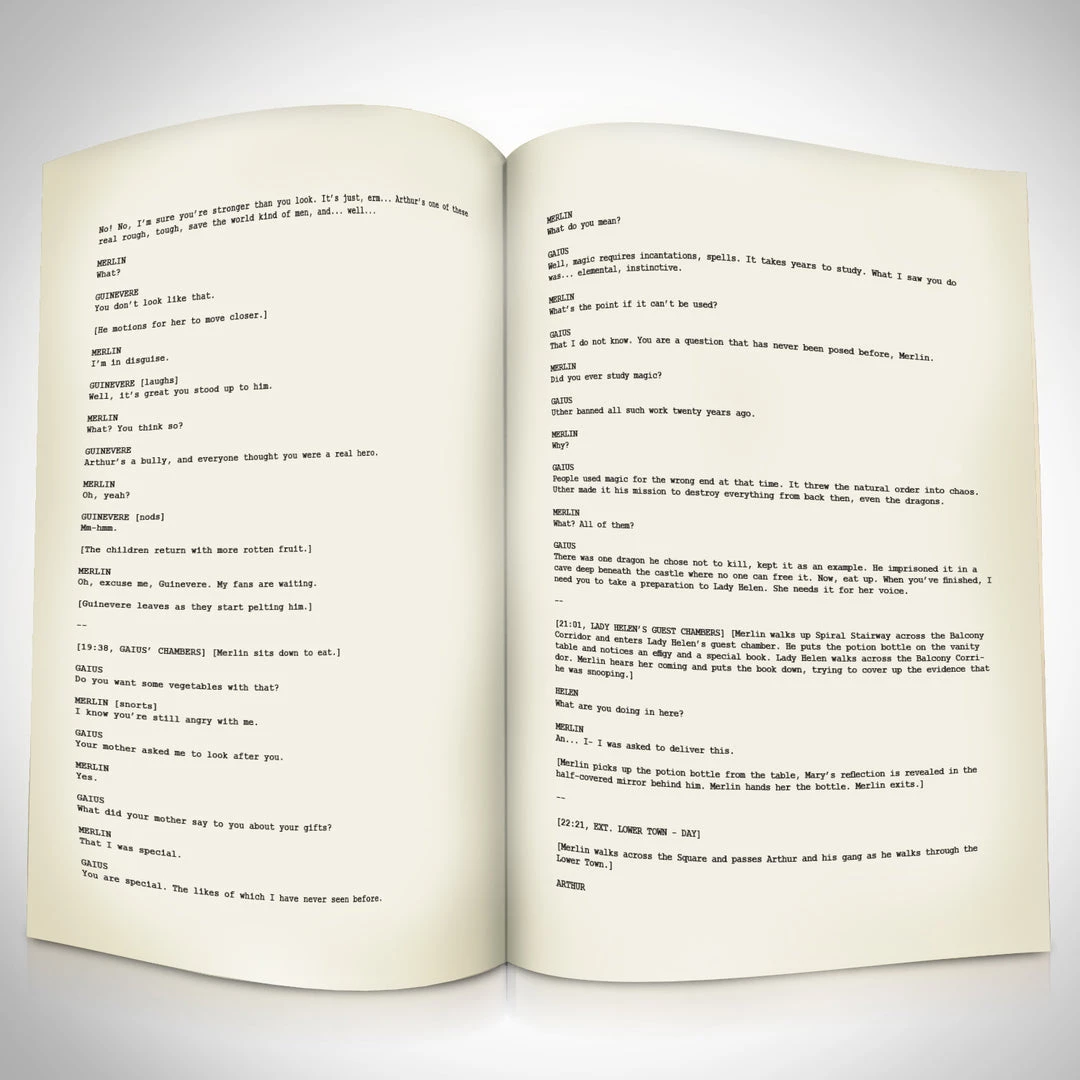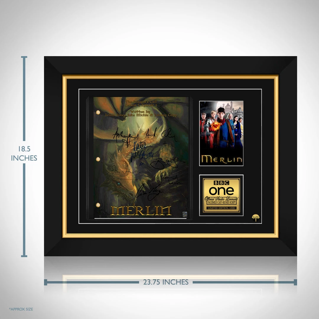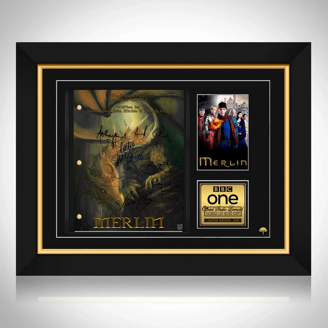 Pay homage to Merlin , with this BBC One fully licensed facsimile of the official signed TV Series script, originally signed by actors John Hurt, Colin Morgan, Bradley James, Richard Wilson, Angel Coulby, Katie McGrath & Anthony Head , of which is strictly limited to 100 units Worldwide and has been approved and numbered accordingly.