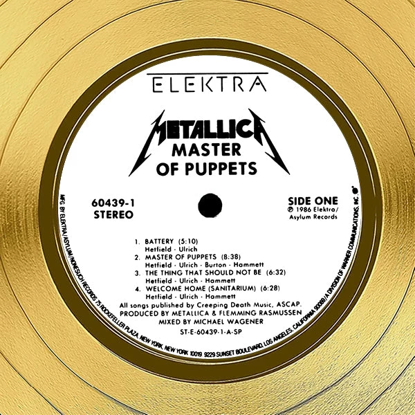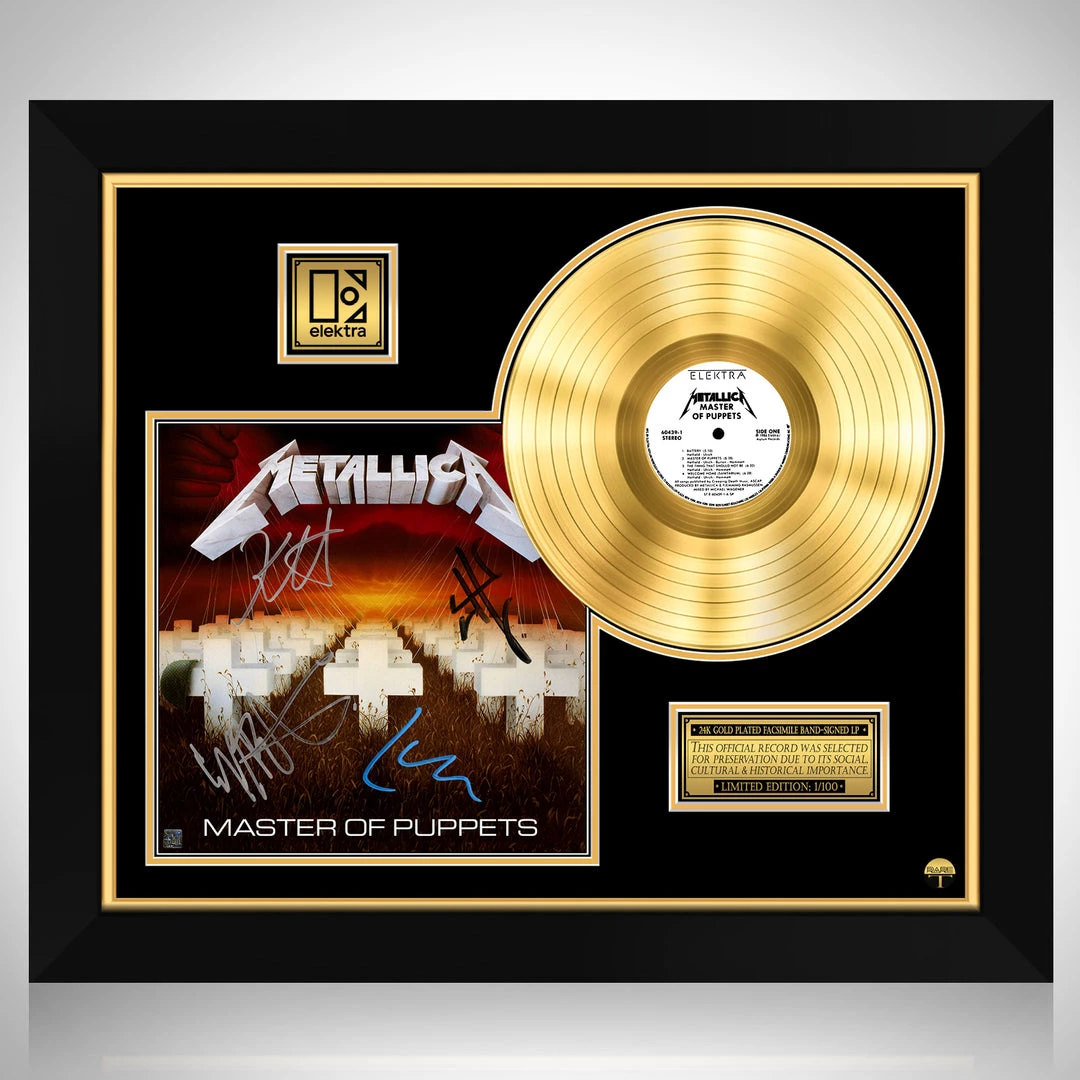 Pay homage to one of the most iconic American Heavy metal band of all time Metallica , with this gallery-framed, authentic Elektra Records fully licensed facsimile of the official Hand-Signed 24K Gold LP Record and LP Cover Master of Puppet Originally signed by James Hetfield, Kirk Hammett, Cliff Burton & Lars Ulrich , of which is strictly limited to 100 units Worldwide and has been approved and numbered accordingly.