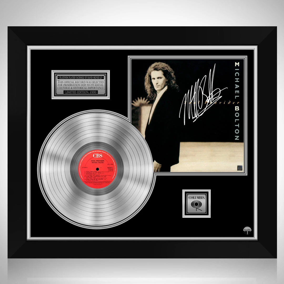 Pay homage to one of the most iconic American singer and songwriter of all time Michael Bolton , with this gallery-framed, authentic Columbia Records fully licensed facsimile of the official Hand-Signed Platinum Plated LP Record and LP Cover Soul Provider Originally signed by Michael Bolton , of which is strictly limited to 100 units Worldwide and has been approved and numbered accordingly.