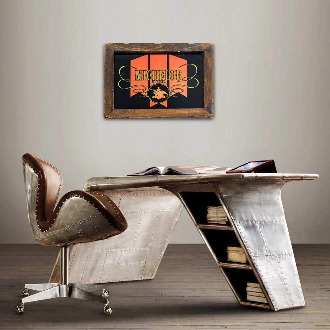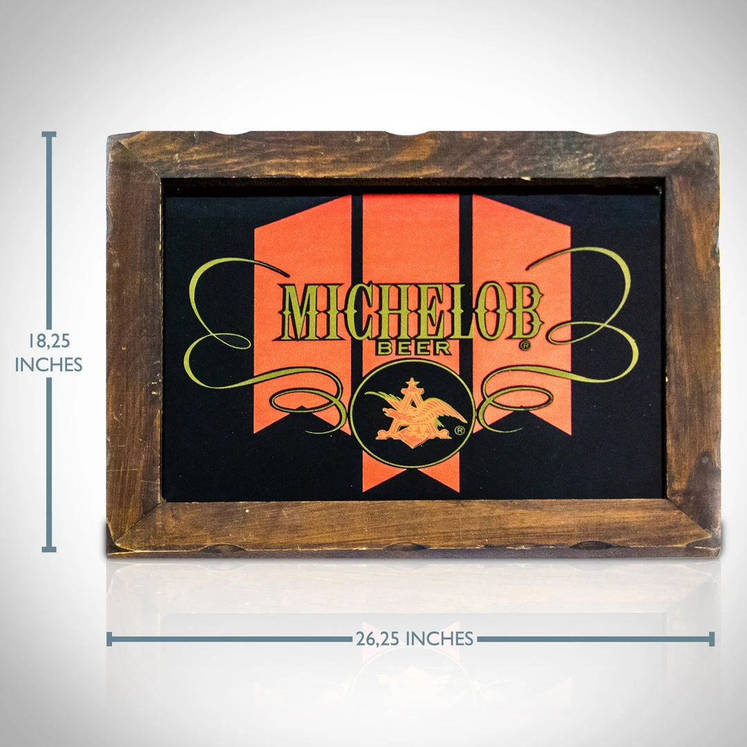 Featuring brightly colored iconic MICHELOB imagery, as well as the ‘Anheuser-Busch‘ name and trademarked eagle insignia , in gold etching, all of which are highlighted by the original dark wood frame.