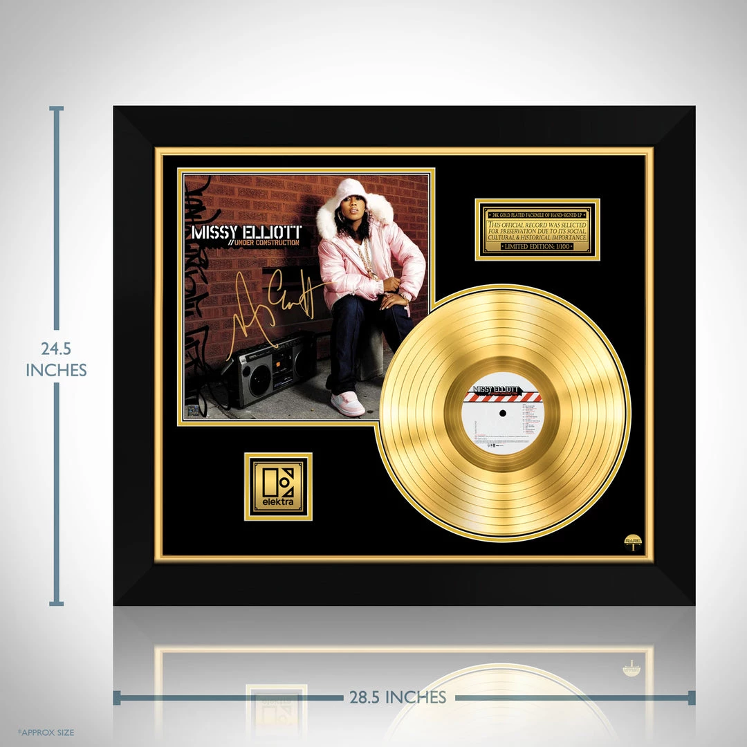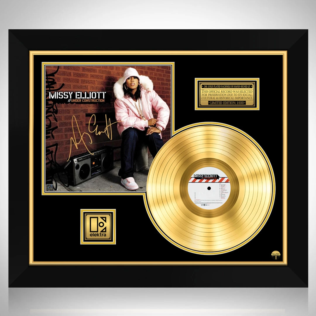 Pay homage to one of the most iconic musician of all time Missy Elliott , with this gallery-framed, authentic Elektra Records fully licensed facsimile of the official Hand-Signed 24K Gold Plated LP Record and LP Cover Under Construction Originally signed by Missy Elliott , of which is strictly limited to 100 units Worldwide and has been approved and numbered accordingly.