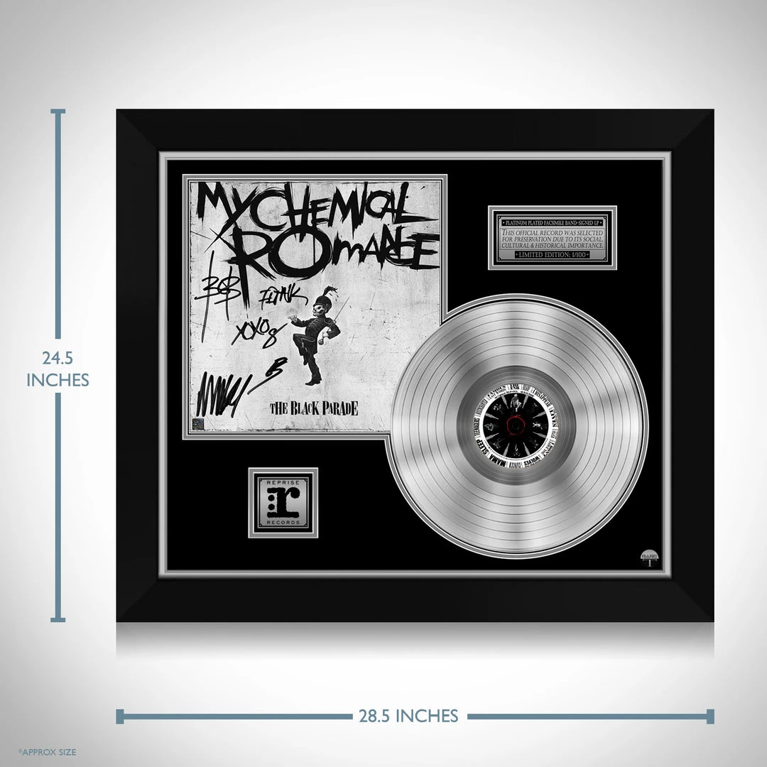 Pay homage to one of the most iconic band of all time My Chemical Romance , with this gallery-framed, authentic Reprise Records fully licensed facsimile of the official Hand-Signed Platinum LP Record and LP Cover The Black Parade Originally signed by Bob Bryar, Frank Iero , Ray Toro, Gerard Way & Mikey Way , of which is strictly limited to 100 units Worldwide and has been approved and numbered accordingly.