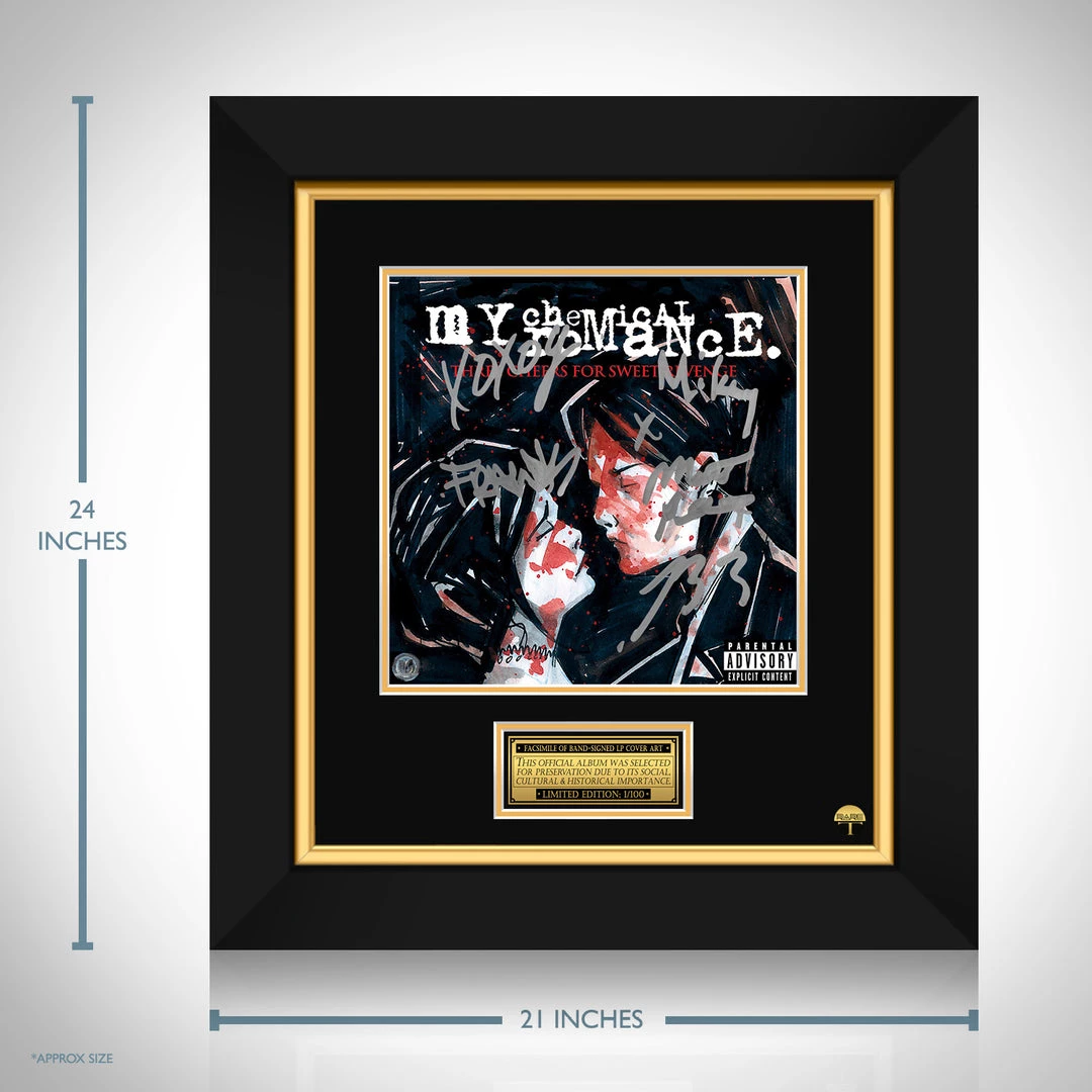 Pay homage to one of the most iconic American rock band of all time, My Chemical Romance , with this gallery-framed, officially licensed, limited edition facsimile of the Hand-Signed Three Cheers for Sweet Revenge LP Cover originally signed by Gerard Way, Ray Toro, Frank Iero & Mikey Way , of which is strictly limited to 100 units Worldwide, and has been approved and numbered accordingly.