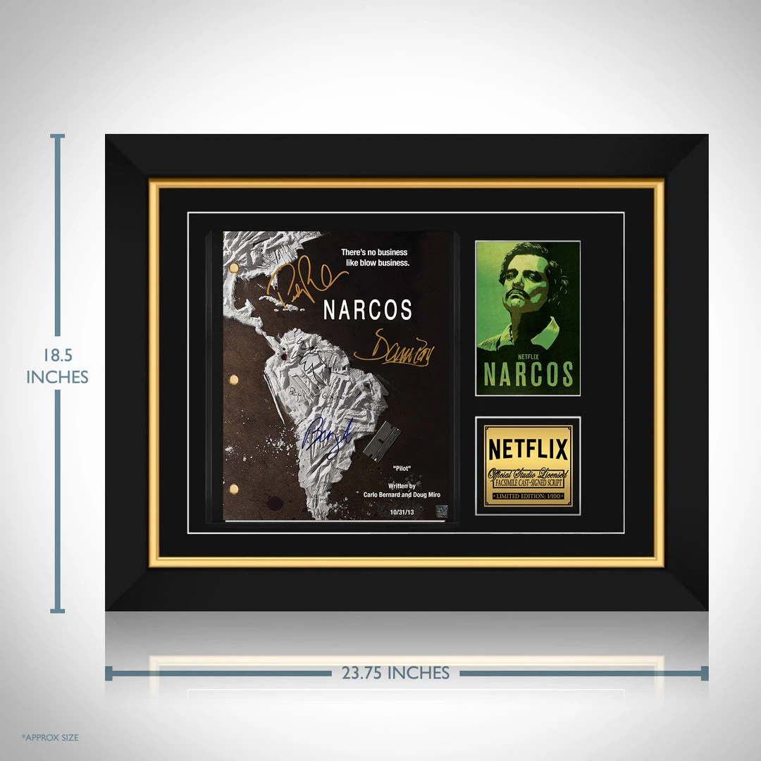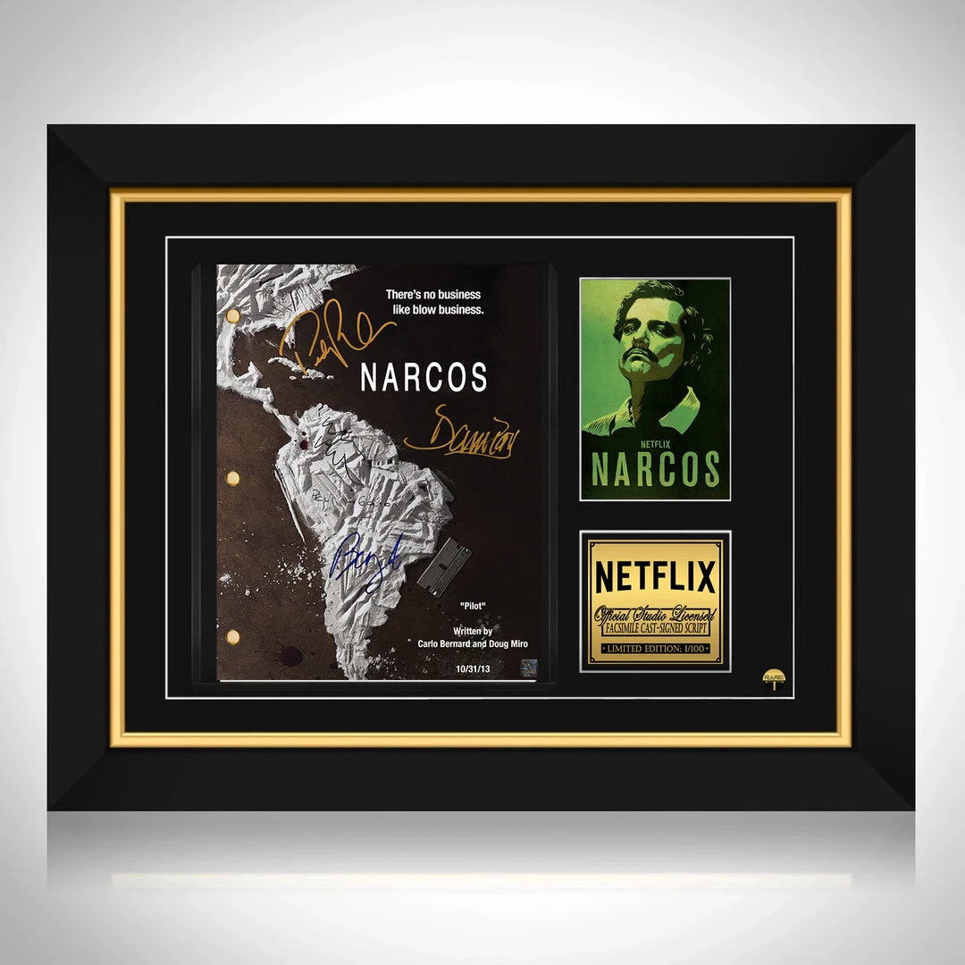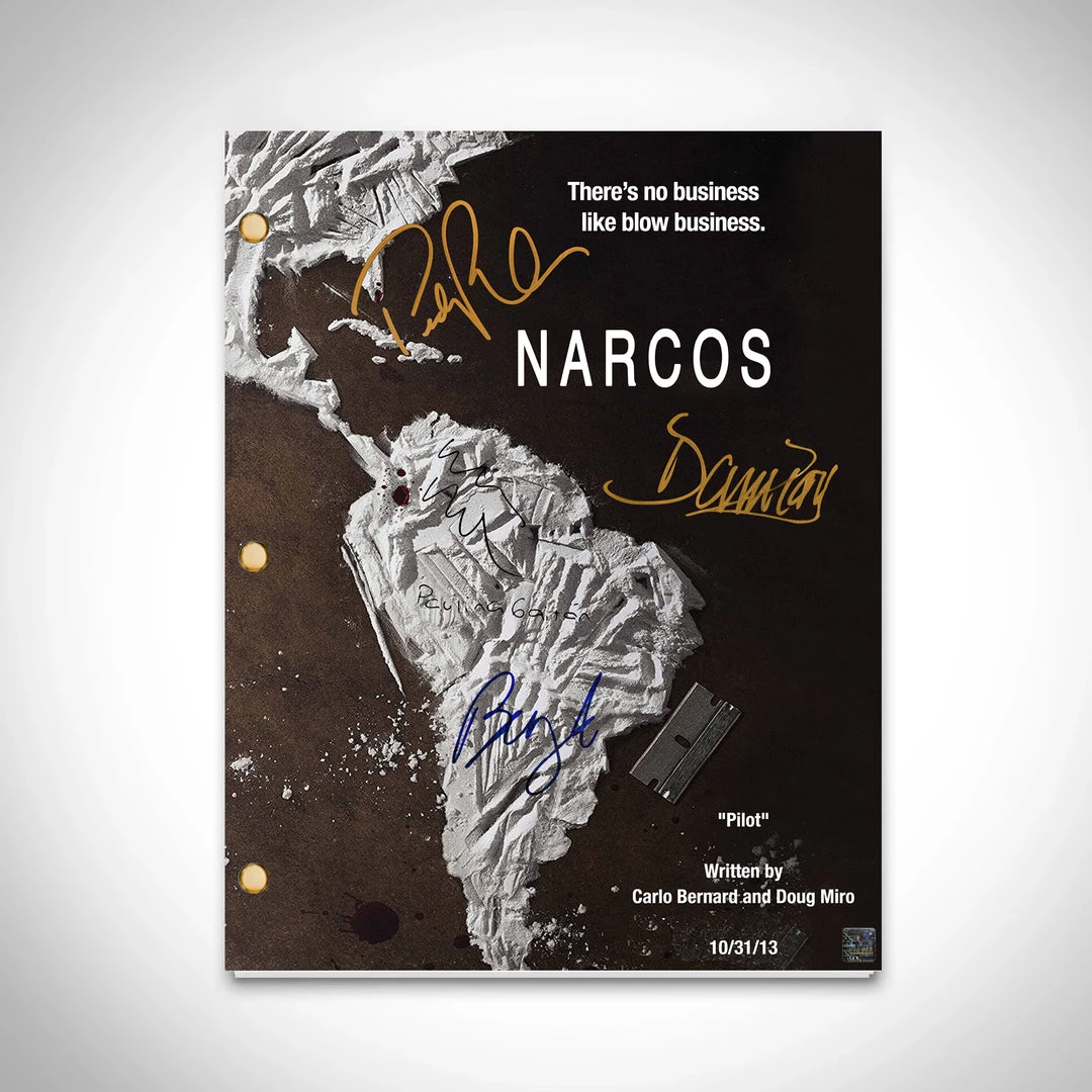 Pay homage to Narcos , with this Netflix fully licensed facsimile of the official signed TV Series script, originally signed by actors Pedro Pascal, Wagner Moura, Boyd Holbrook, Paulina Gaitan & Damián Alcázar , of which is strictly limited to 100 units Worldwide and has been approved and numbered accordingly.